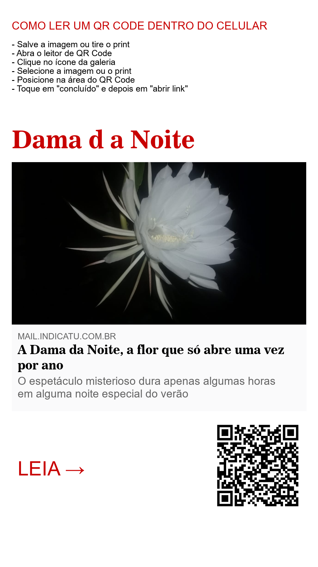 “No fim de alguma tarde especial, você verá a planta apresentando seu nobre boto na singela forma de anunciação de um raro espetáculo que se seguira nas próximas horas. Por volta das 20h já é possível apreciar a beleza e o perfume dessa maravilha. Mas é na madrugada que o fenômeno estará completo. A Dama da Noite, com suas pétalas incrivelmente brancas, atinge o ápice da sua beleza rara e se destaca na escuridão de uma noite escolhida pela natureza para ser especial. Quem espera um ano inteiro para ver essa proeza não poupa energia para recebe-la em dobro ao aproveitar esse momento nobre. E tem que ser assim porque, no amanhecer do outro dia, a flor estará murcha, morta. O espetáculo, que durou apenas algumas horas, só se repetirá 365 dias depois, e a dama especial da noite estará de volta irradiando sua beleza”.