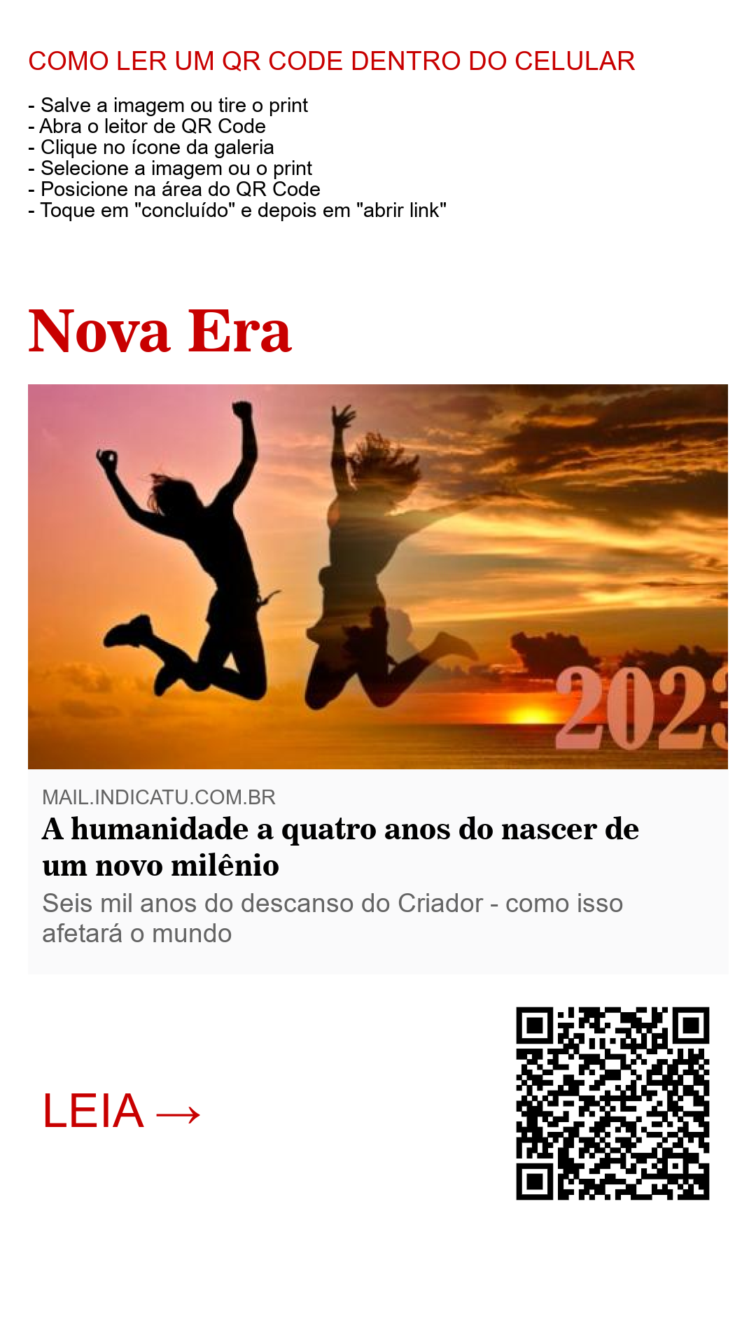 Em 2023, completa-se o ciclo de 6 mil anos do descanso do Criador desde sua última criação, Eva. Isto afetará de forma direta todo indivíduo vivo atualmente e significará o fim de toda forma de governo liderado pelo homem. Este traz em seu bojo um histórico de fracasso, angústia, opressão e todo tipo de sofrimento que parece não ter fim, mas, para o nosso alívio, apenas ‘parece’, porque os dias desses governos foram contados e estão à beira do seu limite final. Será o fim da iniquidade em todo o corpo social que abrange os maiores pilares que sustentam toda uma vidraça de ilusões, a saber, o sistema político, comercial e religioso, construídos com o propósito de iludir e desvirar o foco dos ocupantes desta esteira rolante que conduz o mundo para o precipício que se esconde atrás dela.