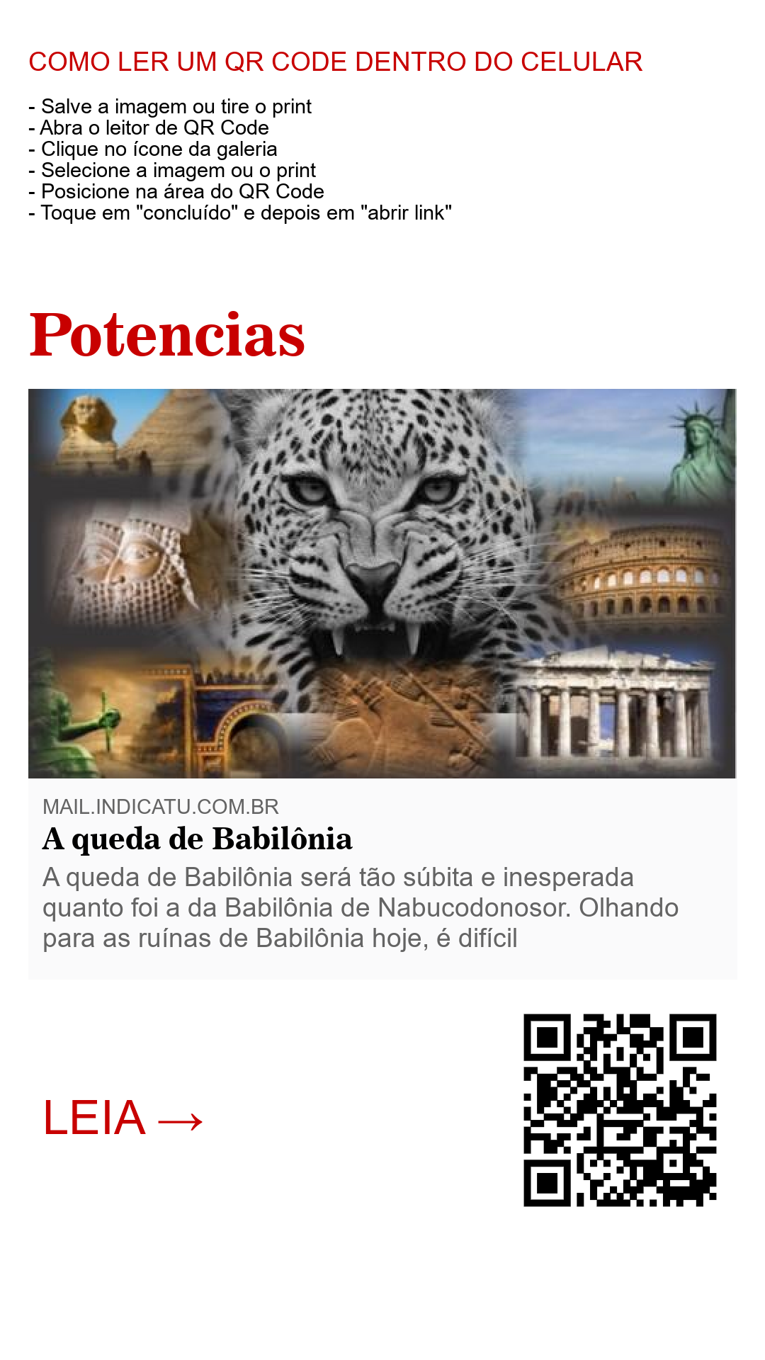 A queda de Babilônia será tão súbita e inesperada quanto foi a da Babilônia de Nabucodonosor. Olhando para as ruínas de Babilônia hoje, é difícil acreditar que aquilo já foi uma potência mundial. A Babilônia de Nabucodonosor sobrepujou muitas nações. Humilhava reinos, levava embora cativos lhes negava a esperança de liberdade (Jeremias 50:33). A glória da antiga Babilônia era tal que nem precisa dizer que uma parte dela hoje é uma das 7 ou 8 maravilhas do mundo.