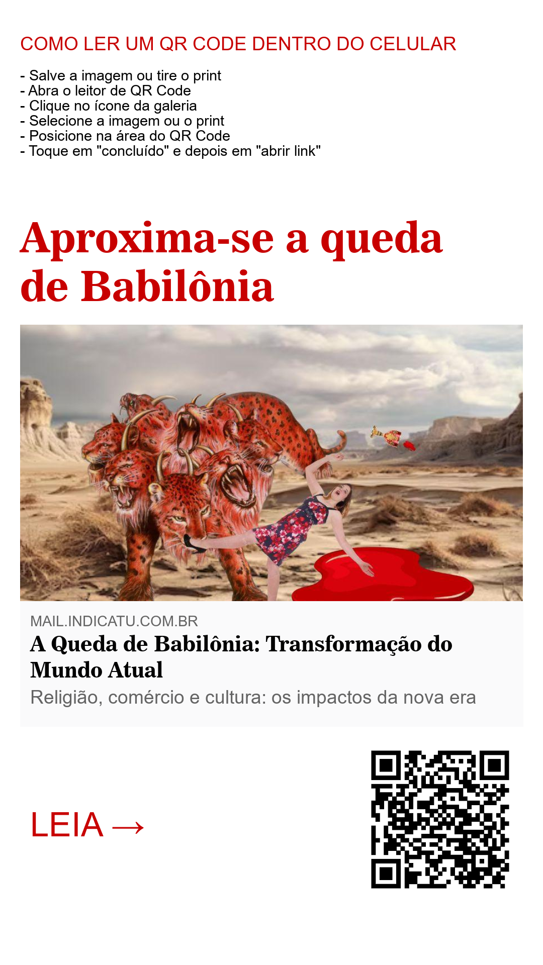 A queda de Babilônia, a Grande, será um divisor de águas na história da humanidade. Representando o colapso de um império religioso global, essa mudança afetará profundamente todos os aspectos da sociedade. Babilônia, identificada como um sistema de religiões que afirmam representar Deus, exerce uma influência gigantesca no mundo. Seus reflexos estão em quase tudo ao nosso redor: cidades com nomes de santos, ruas homenageando figuras religiosas e tradições enraizadas em práticas da Igreja. Sua derrocada trará uma ruptura abrupta com esse legado, deixando o mundo questionando seu passado e tentando entender o impacto de um futuro sem esse pilar de sustentação (Apocalipse 18:2-3).