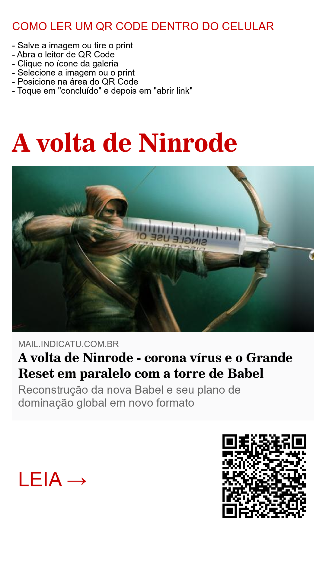 Os planos que se escondem por trás da máscara da covid-19 não darão certo. Tal qual a antiga Babel, eles “construirão a torre”, mas não concluirão a cidade. Uma mão forte atingirá o coração da velha grande cidade, Babilônia a Grande. Sua ruína não terá restauração. (Apocalipse 18: 10, 21)