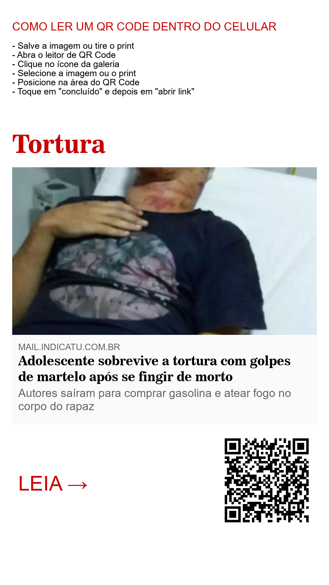 Em seguida, os autores amarraram o adolescente em uma arvore para comprar gasolina e atear fogo no “corpo”. A intensão deles era matar o rapaz. Quando viu que o trio havia saído, o adolescente conseguiu se desamarrar e fugiu para pedir ajuda. Ao chegar à casa de um homem, foi socorrido e levado para o Hospital Municipal de Teixeira de Freitas, onde ficou internado em estado grave sob o risco de morte.