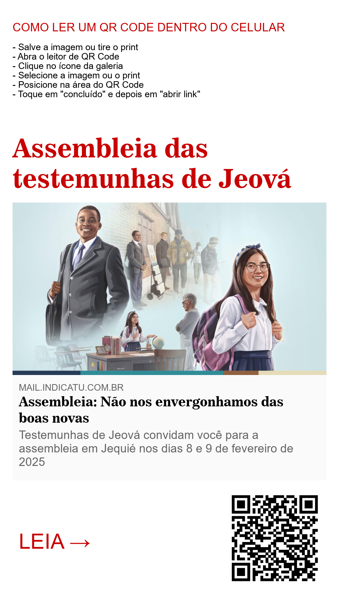 As testemunhas de Jeová convidam você para a primeira assembleia de circuito de 2025. O tema é: ‘Não nos Envergonhamos das Boas Novas’. O evento será neste fim de semana em Jequié, nos dias 8 e 9, na Arena da AABB, Centro Industrial de Jequié. A assembleia será dividida em duas partes, A e B. A programação é igual para os dois públicos.