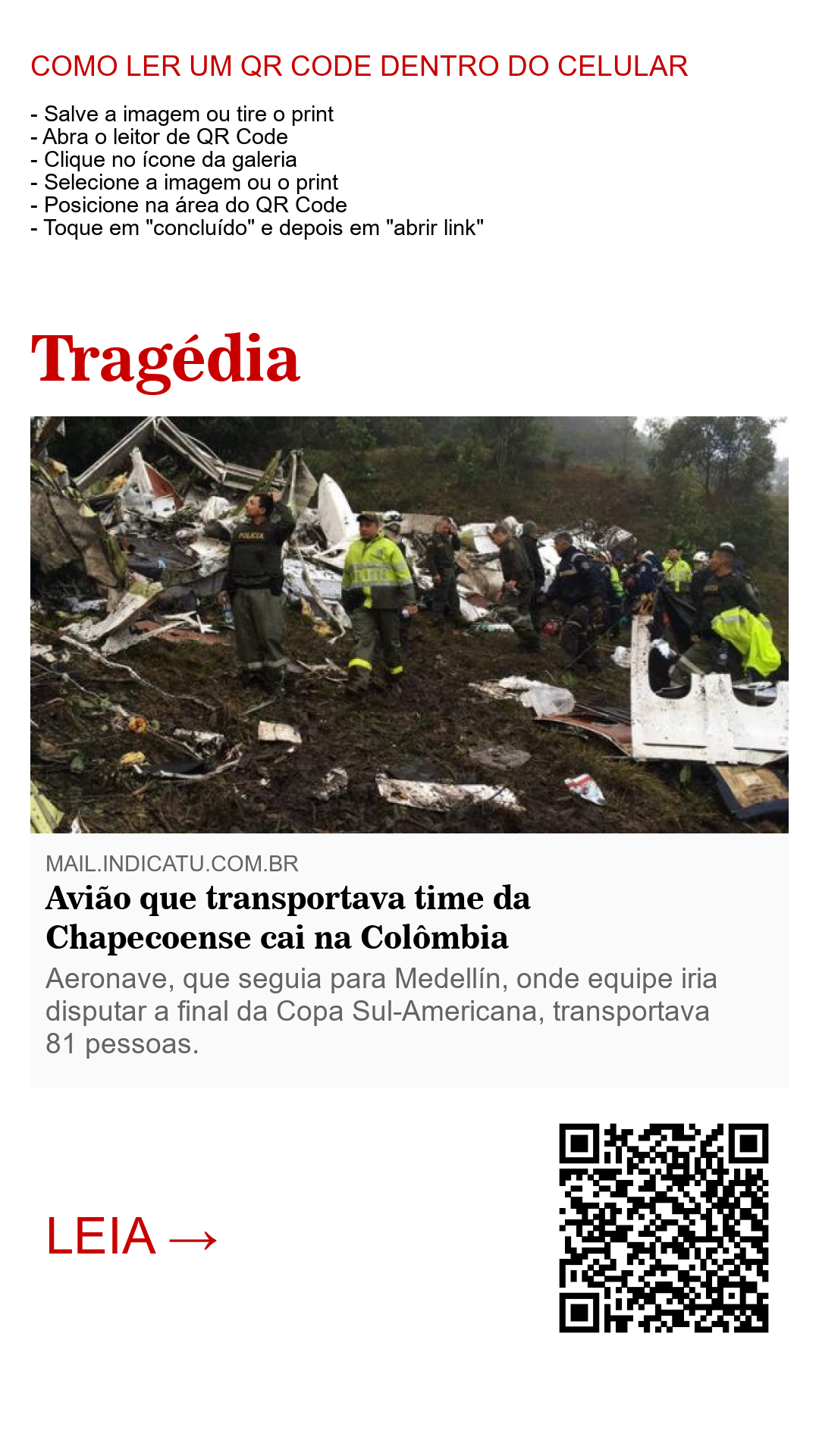 Um avião que transportava a delegação do clube de futebol Chapecoense sofreu um acidente na noite da segunda-feira quando se aproximava do aeroporto José María Córdova, na cidade de Medellín, na Colômbia. A aeronave, da companhia boliviana LAMIA, tinha 81 pessoas a bordo, sendo 72 passageiros entre membros da equipe e jornalistas, e nove membros da tripulação. As primeiras informações dão conta de pelo menos seis sobreviventes. O jogador Alan Ruschel foi a primeira vítima a chegar no hospital de La Ceja, a localidade mais próxima do ocorrido, segundo relato da agência EFE a partir do local, para onde os feridos estão sendo transportados.