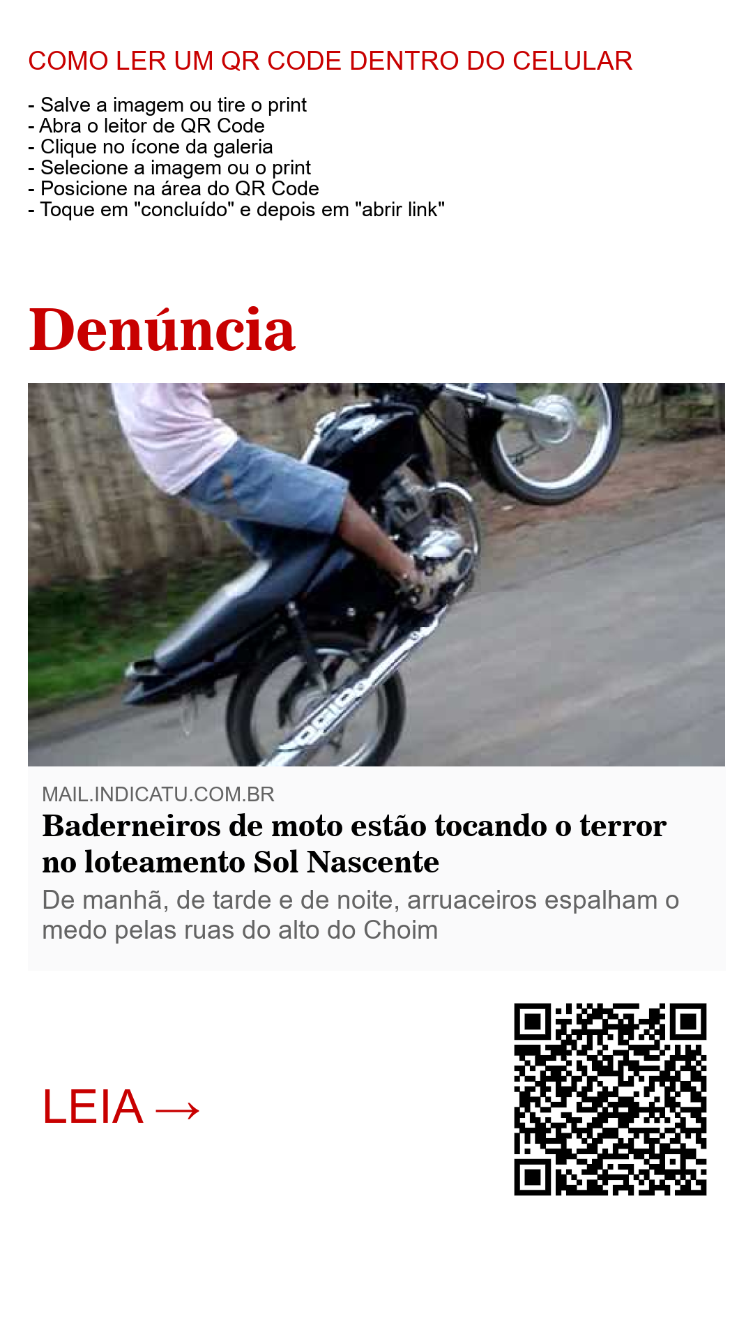 Os moradores do loteamento Sol Nascente, no bairro Joaquim Romão, estão pedindo socorro às autoridades para dar um basta à ousadia flagrante de motociclistas arruaceiros que estão perturbando a paz e o sossego da comunidade. “Não tem dia nem hora. A todo momento é um empinando moto, tocando a descarga... é um verdadeiro inferno. O bairro que era sossegado perdeu a paz”, disse um morador insatisfeito com a situação. “Já denunciei à polícia militar e a pessoa que atendeu disse que se continuasse assim que era pra ligar de novo. Isso foi há 4 meses atrás”, contou outro morador que não quis se identificar.