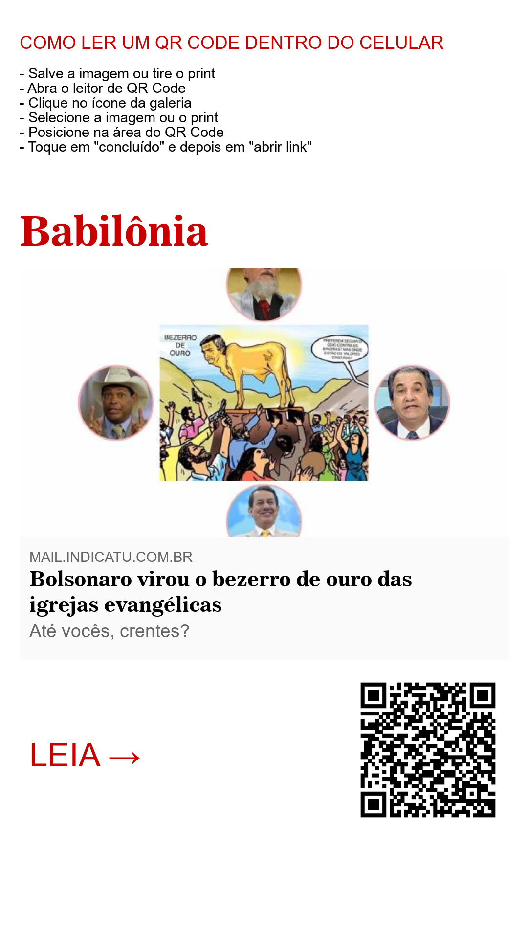 Edir Macedo, líder da igreja Universal do Reino de Deus, debocha dos fiéis ao usar os púlpitos dos seus templos e as bocas dos jornalistas dos seus meios de comunicação para propagar essa idolatria. Logo ele que, apesar de estar associado ao PT na era Dilma como carne e unha, agora faz campanha contra o partido que era, de certa forma, amigo dele. Ele que também usa o seu canal de TV para dramatizar histórias da bíblia e “divertir” o público, esquece-se de que a idolatria ao estado e (ou) ao seu líder, é um ato reprovado por Deus. Para sermos generosos na classificação, isto seria, no mínimo, uma afronta ao autor da verdade, O Deus que ele afirma representar, mas que parece não se importar com o peso de suas ações nas costas dos fiéis que pagam para manter funcionando todo um predominante “esquema mitológico” administrado por ele.