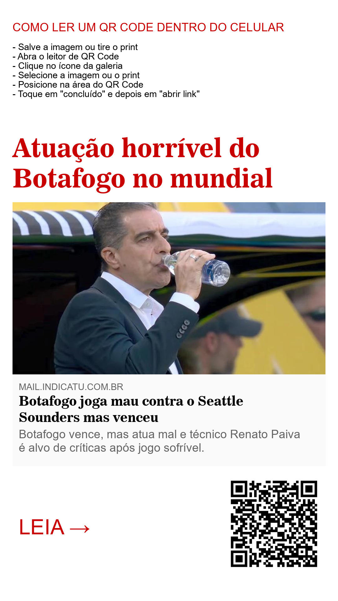 Jogo horrível do Botafogo no segundo tempo. Péssimo. Assustador. Parecia time de bairro jogando pelada. Nervosismo? Talvez. Mas o que ficou claro mesmo foi a incompetência e irresponsabilidade do técnico Renato Paiva. E não só dele: o Cuiabano, que parece a Uni do Caverna do Dragão — sempre atrapalhando o grupo — também contribuiu para o caos. Eles parecem conspirar juntos para a desgraça do clube. Deram sorte de não levar o empate. E mereciam. A atuação do Alvinegro no Mundial de Clubes foi amedrontadora na estreia do clube.