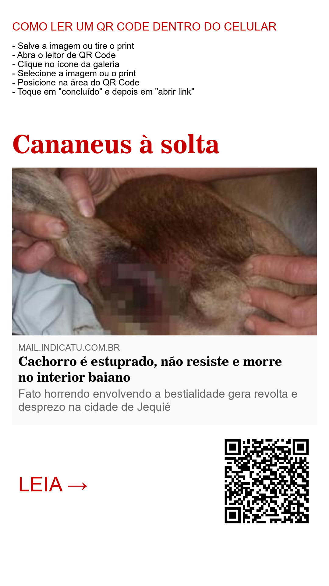 Uma prática cananeia se repete na cidade de Jequié, município do interior baiano, onde um cão foi estuprado e morto não resistindo aos abusos dos seus algozes cananeus. Um apetite sexual voraz e macabro levou indivíduos a violentarem um cão, deixando-o gravemente lesionado e em estado decadente.