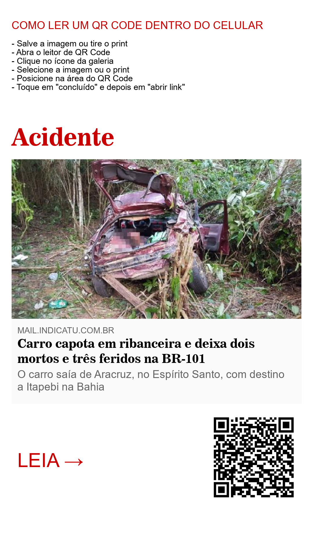 Um grave acidente envolvendo um veículo Chevrolet Corsa de cor vinho, nas alturas do quilômetro 889 da br-101, próximo ao município de Teixeira de Freitas, deixou duas vítimas fatais e três feridos, nesta tarde de sexta-feira (29). O veículo saiu de Aracruz, no Espírito Santo, com destino a Itapebi-BA. As causas frequentes de mortes na cidade estão relacionadas com o alto número de homicidios e acidentes graves.