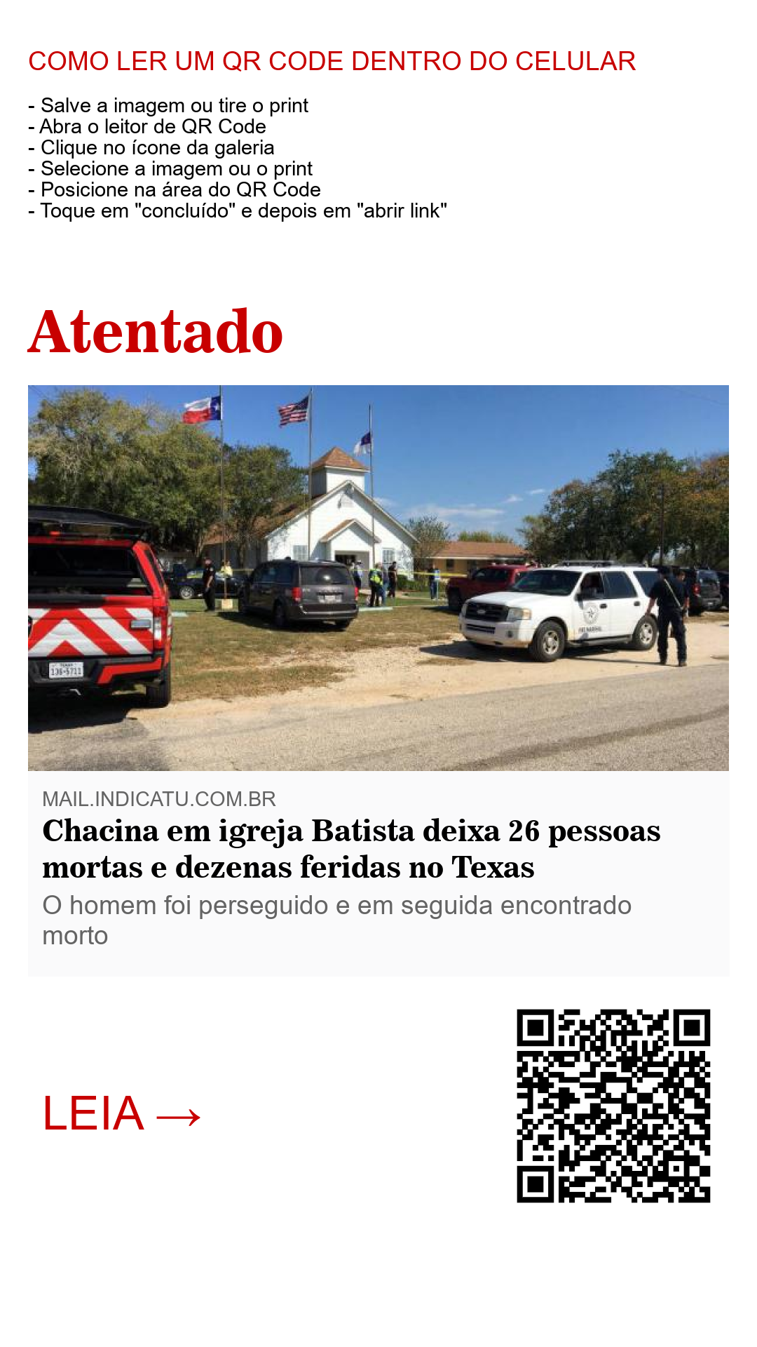 Uma chacina em uma igreja Batista aterrorizou fiéis nesta tarde de Domingo (05) durante uma missa na pequena cidade de Southland Springs, no Texas. Um atirador invadiu a igreja e disparou vários tiros contra os fiéis deixando 26 pessoas mortas e mais 24 feridas. Entre as vítimas está uma criança de 2 anos de idade.