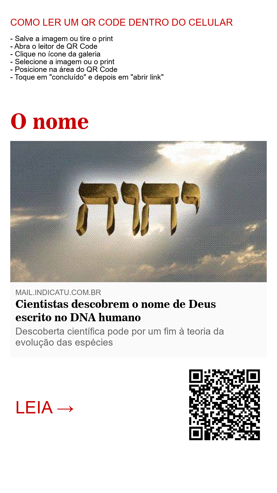 Acontece que o nosso DNA segue um padrão 'ligado por pontes' que se alternam da seguinte forma: 10 5 6 5.No hebráico, idioma original da escrita do nome de Deus, cada letra do alfabeto equivale a um número. Curiosamente, as quatro consoantes hebráicas ( יחוח ), conhecidas como tetragrama, escritas da direita para a esquerda, formando o nome divino, ocupam posições numéricas do alfabéto equivalentes ao padrão de alternância do nosso DNA. Veja: Yud(10) - Hay(5) - Vav(6) - Hay(5).Essas letras hebraicas, quando transliteradas para o Português, ganham a forma de: YHWH ou YHVH. Para dar sentido ao nome em português, usa-se vogais e consoantes, as letras que mais se assemelham ao som original do nome. São elas: J - E - O - V - A ou JEOVÁ. Fascinante, não é?