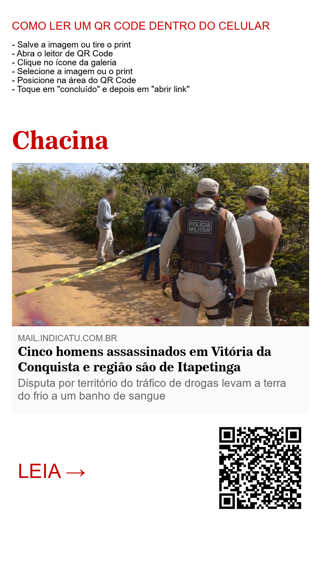8.919 visualizações Cinco homens assassinados em Vitória da Conquista e região são de Itapetinga Disputa por território do tráfico de drogas levam a terra do frio a um banho de sangue Publicado em: 25/07/2017 20:00 Atualizado em: 07/03/2026 02:18 Por: Indicatu | Agência Indicatu - São Paulo-SP Foto: Reprodução Leia mais em Polícia Dois corpos encontrados pela polícia militar de Vitória da Conquista nesta manhã de Terça-Feira (25) em uma estrada vicinal, região conhecida como Pedra Branca, são de Itapetinga. De acordo com informações de jornais da região, os homens estavam em Vitória da Conquista para 'tomar' pontos de tráfico de drogas de traficantes rivais. Toque na tela Os mesmos foram sequestrados e levados até a região da Pedra Branca em Vitória da conquista e executados a tiros e facadas. O ódio dos bandidos não parou por aí. Depois disso, mais três corpos, também de Itapetinga, foram encontrados carbonizados no município de Maiquinique, região de Itapetinga. A suspeita é que os crimes tenham relação direta um com o outro. Segundo informações de jornais locais, a busca por campos abertos do grupo do traficante 'Nem Bomba' tem encontrado obstáculos em seu caminho, não lhe restando outra opção, a não ser, exterminar todos os seus desafetos. Entre eles está o grupo conhecido como Dona Maria, uma organização criminosa liderada por um indivíduo de prenome 'Valdir' de vitória da conquista, com ramificações na cidade de Itapetinga. A polícia Civil, tanto de Vitória da Conquista quanto de Itapetinga já deram início às investigações. Os nomes dos homens mortos na região da Pedra Branca são Ezequiel e Messias Júnior. AGÊNCIA INDICATU - SP/BR - 25/07 FIM Redação Indicatu Jornalismo Independente e Marketing de Conteúdo