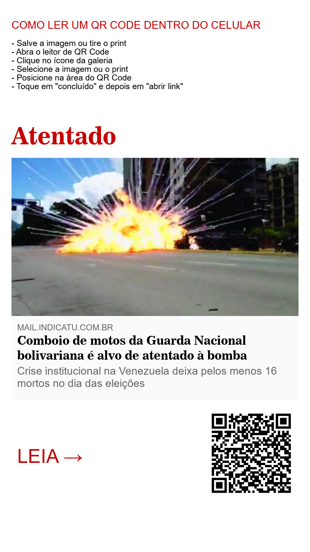 Um comboio de motos da Força Nacional Bolivariana foi alvo de um atentado à bomba neste domingo, dia das votações para a assembleia constituinte. Segundo fontes locais 08 policiais ficaram feridos no atentado e pelo menos 16 civis foram mortos durante o dia de votação.