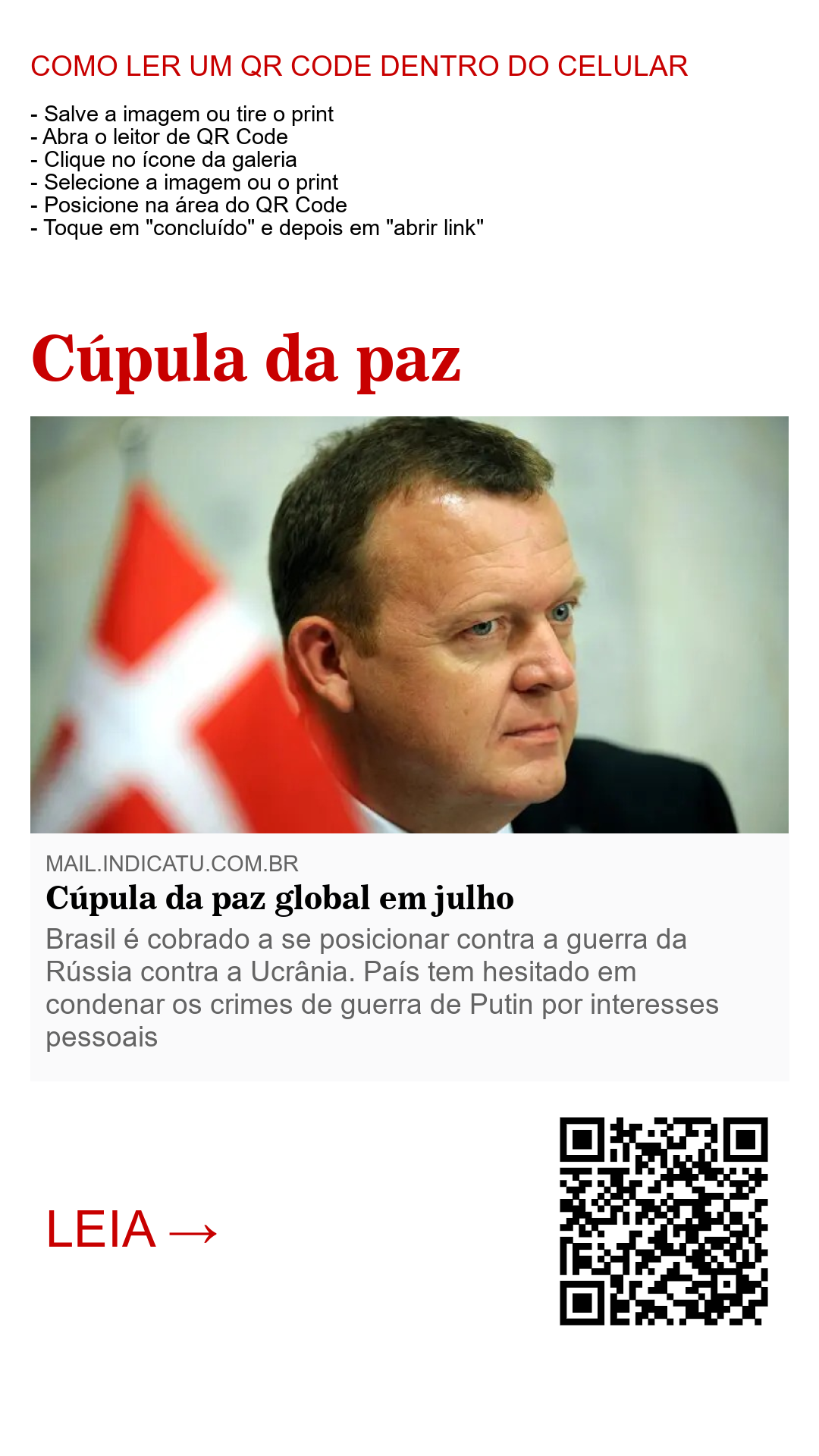 A Dinamarca se ofereceu para sediar a cúpula da paz global prevista para o mês de julho deste ano, 2023. De acordo com o Ministro das Relações Exteriores da Dinamarca, Lars Lokke, o evento depende, exclusivamente, do Brasil, Índia e China para acontecer. Esses países são os principais apoiadores da Rússia.