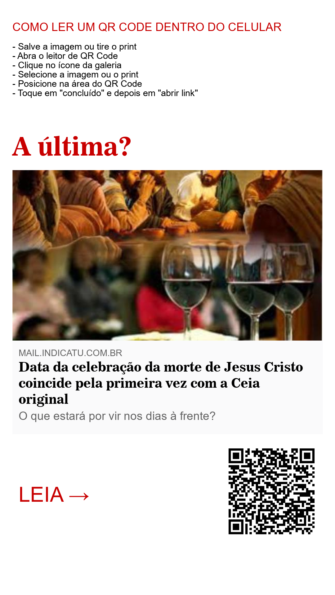 Será essa a última? Talvez sim, talvez não, não sabemos. Iremos continuar a celebrar a morte de Jesus até que ele chegue. Sabemos que o fim está muito próximo, mas não há como prever uma data para isso. Jesus disse que ninguém saberia a data do fim. Milhões de cristãos do mundo inteiro que estarão presentes ao evento mais importante para a humanidade pensa assim.