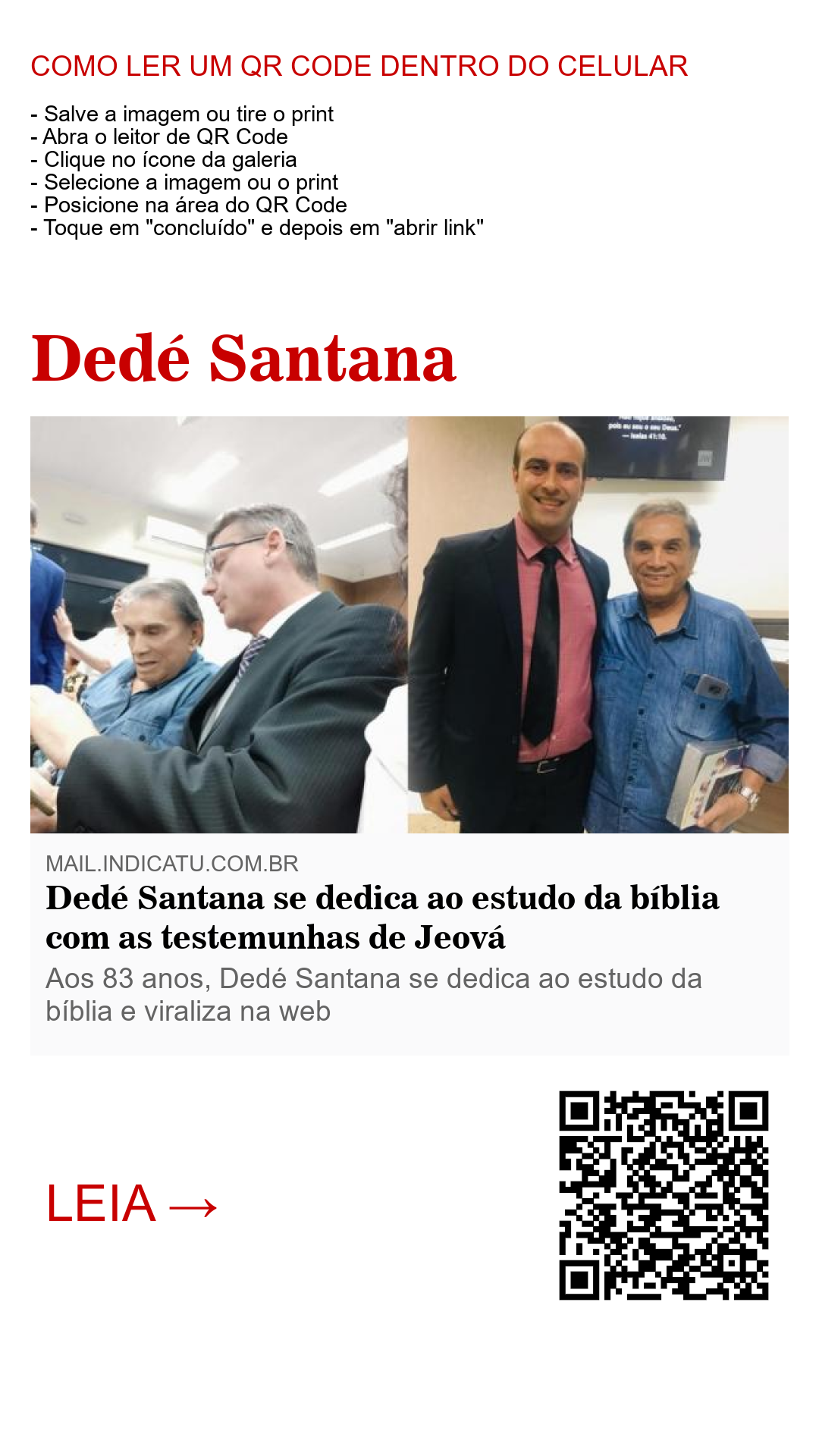 Segundo as informações, Dedé Santana está estudando a bíblia com as testemunhas de Jeová e assiste às reuniões semanais em uma congregação local do grupo. “Ele fez milhões de pessoas sorrirem e agora faz Deus feliz”, disse uma internauta. “Ele fez a melhor escolha da vida dele. Nunca vai se arrepender”, comentou outra jovem na página ‘Universo TJ’, uma das dezenas de páginas onde a notícia da nova faze da vida do artista circulou com força nas últimas semanas.