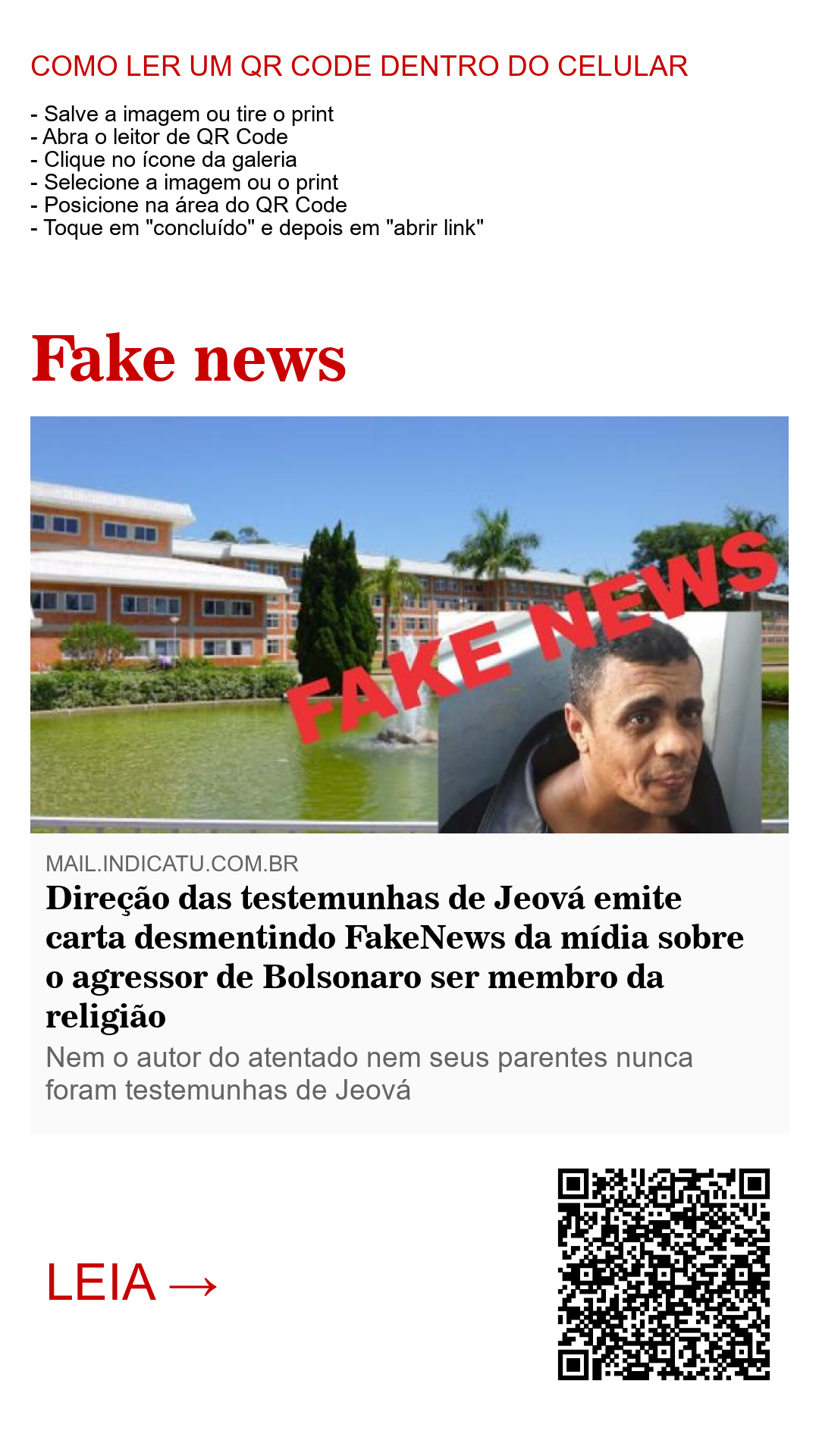 A filial das testemunhas de Jeová no Brasil, localizada em Cesário Lange, São Paulo, emitiu neste fim de semana cartas para as mais de 11 mil congregações no país desmentindo a falsa notícia que circulou em vários jornais ditos sérios e de grande circulação no país com a informação de que o agressor da "facada" dada no candidato à presidência, Jair Bolsonaro, no último dia 06, por volta das 14h na cidade de Juiz de fora, Minas Gerais, era membro da religião.