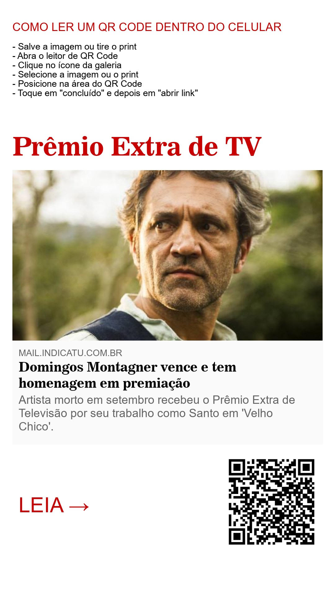 Domingos Montagner foi eleito o melhor ator no Prêmio Extra de Televisão, que aconteceu na noite desta terça-feira. O ator recebeu uma homenagem por seu papel como o protagonista Santo, na novela Velho Chico. Montagner morreu em setembro ao se afogar enquanto nadava no rio São Francisco, durante um intervalo das gravações do folhetim.