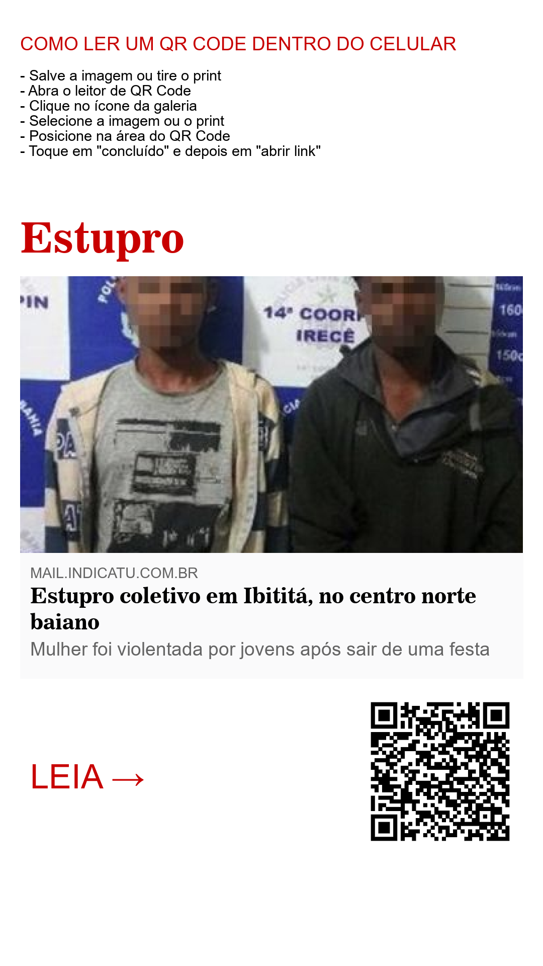 Um caso de estupro coletivo foi registrado na Bahia. Uma mulher de 35 anos de idade foi estuprada por 04 homens, sendo dois menores e dois maiores de idade, após sair de uma festa na madrugada de segunda-feira (07) em Ibititá, região de Irecê na Bahia.