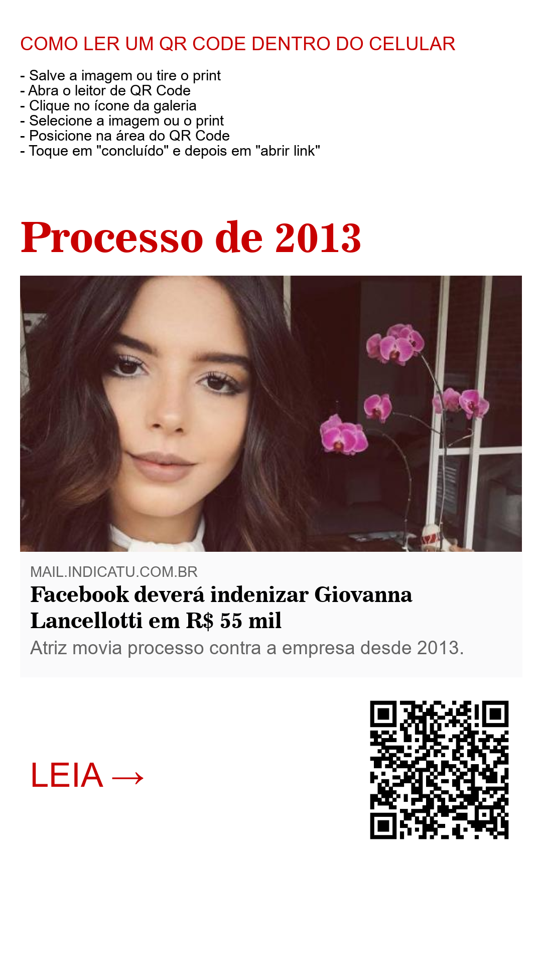 O Facebook foi condenado a indenizar Giovanna Lancellotti em 55.000 reais por um processo de danos morais que a atriz movia contra a empresa. Giovanna entrou com a ação em 2013. Ela pediu a exclusão de 59 perfis falsos com seu nome e dez comunidades que a ofendiam, mas não foi atendida pela rede social.