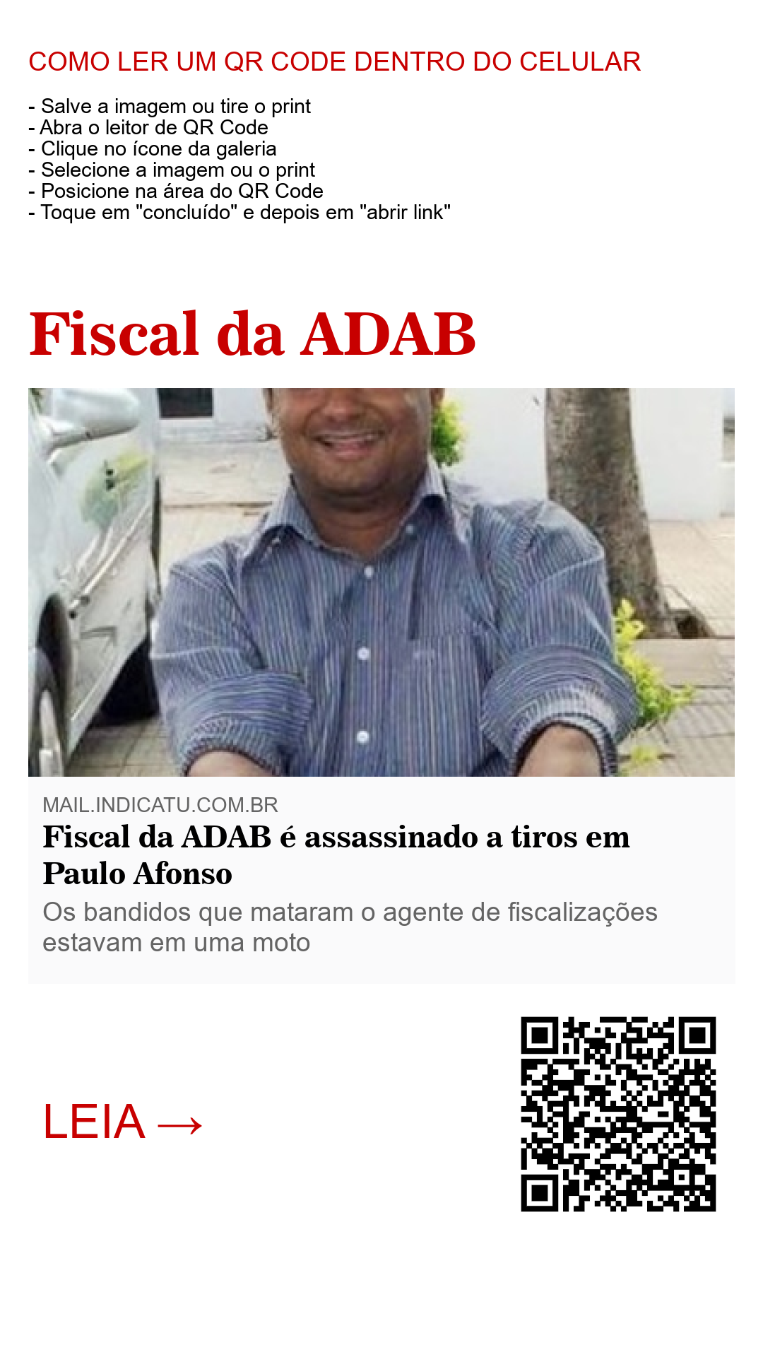 Dois homens a bordo de uma motocicleta, na altura da BR-110 em Paulo Afonso, próximo da divisa com Alagoas, executaram a tiros a Mário Gomes de 41 anos de idade, popularmente conhecido como Marinho, também atuante fiscal da ADAB (Agência de Defesa Agropecuária da Bahia) nesta tarde de quinta-feira (10), na região norte do estado.
