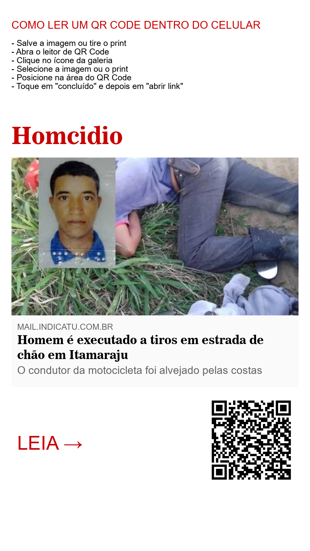 Um homem de 33 anos de idade foi morto nesta tade de segunda-feira (07) em uma estrada vicinal no distrito de Pirajá nas imediações de Itamaraju na Bahia. Segundo informações da mídia local, o homem trafegava pela estrada em uma motocicleta quando foi perseguido e morto a tiros que atingiram suas costas.