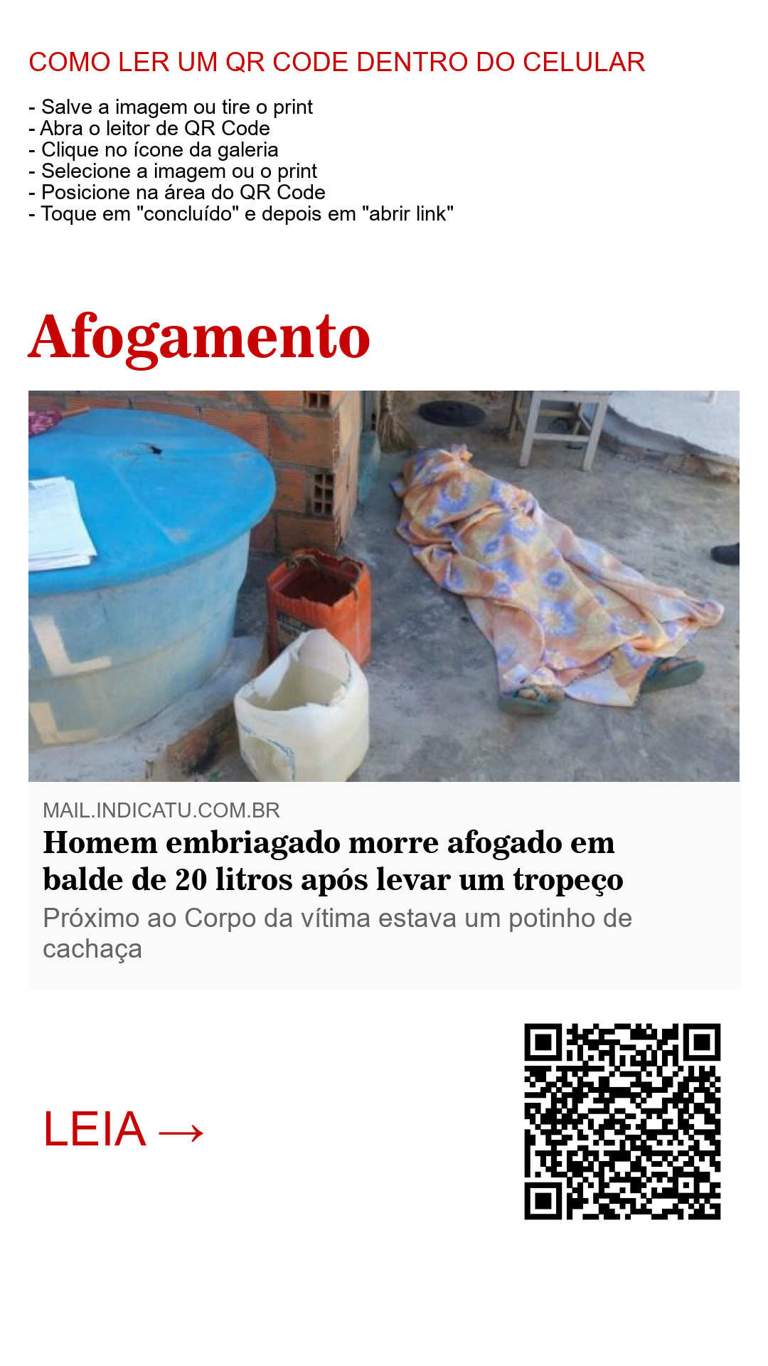 Segundo informações da Polícia Militar, faleceu neste domingo (22), Raildo Matias Santos que, de forma inesperada, teve sua vida interrompida por um simples tropeção dando de encontro com um balde de 20 litros cheio d'água, onde ficou com sua cabeça introduzida no recipiente, tendo morte por afogamento.