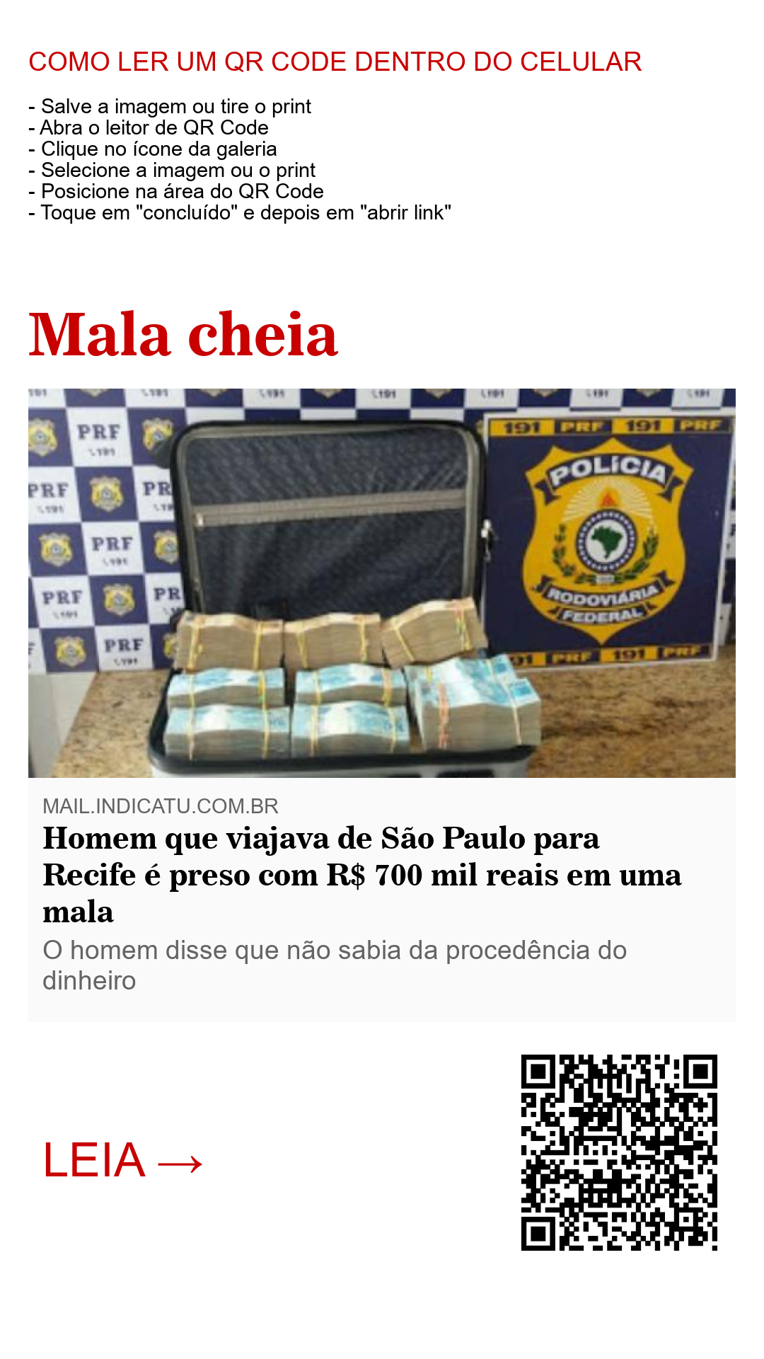 Para a Polícia Rodoviária Federal o homem disse que não sabia da procedência do dinheiro, que o mesmo estava em Brasília, foi para São Paulo, onde recebeu a tal mala, e estava de viagem para Recife.