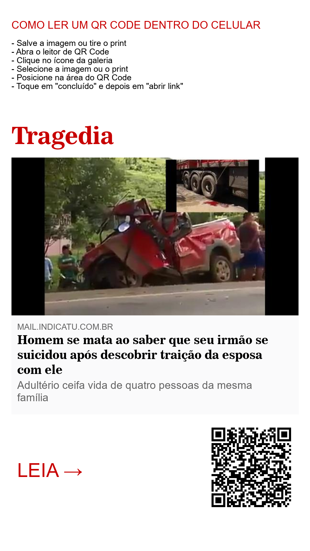 Ao chegar ao local do acidente, seu irmão, desconfiando que não se tratava de um simples acidente, mas de suicídio, percebeu que o irmão teria posto fim à própria vida e da sua esposa por conta da traição dele com sua amante, a qual era sua cunhada. Então, o homem pegou sua motocicleta e, mais adiante,  a estacionou à beira da pista e se jogou embaixo de um carreta que passava pelo local no momento, morrendo esmagado.