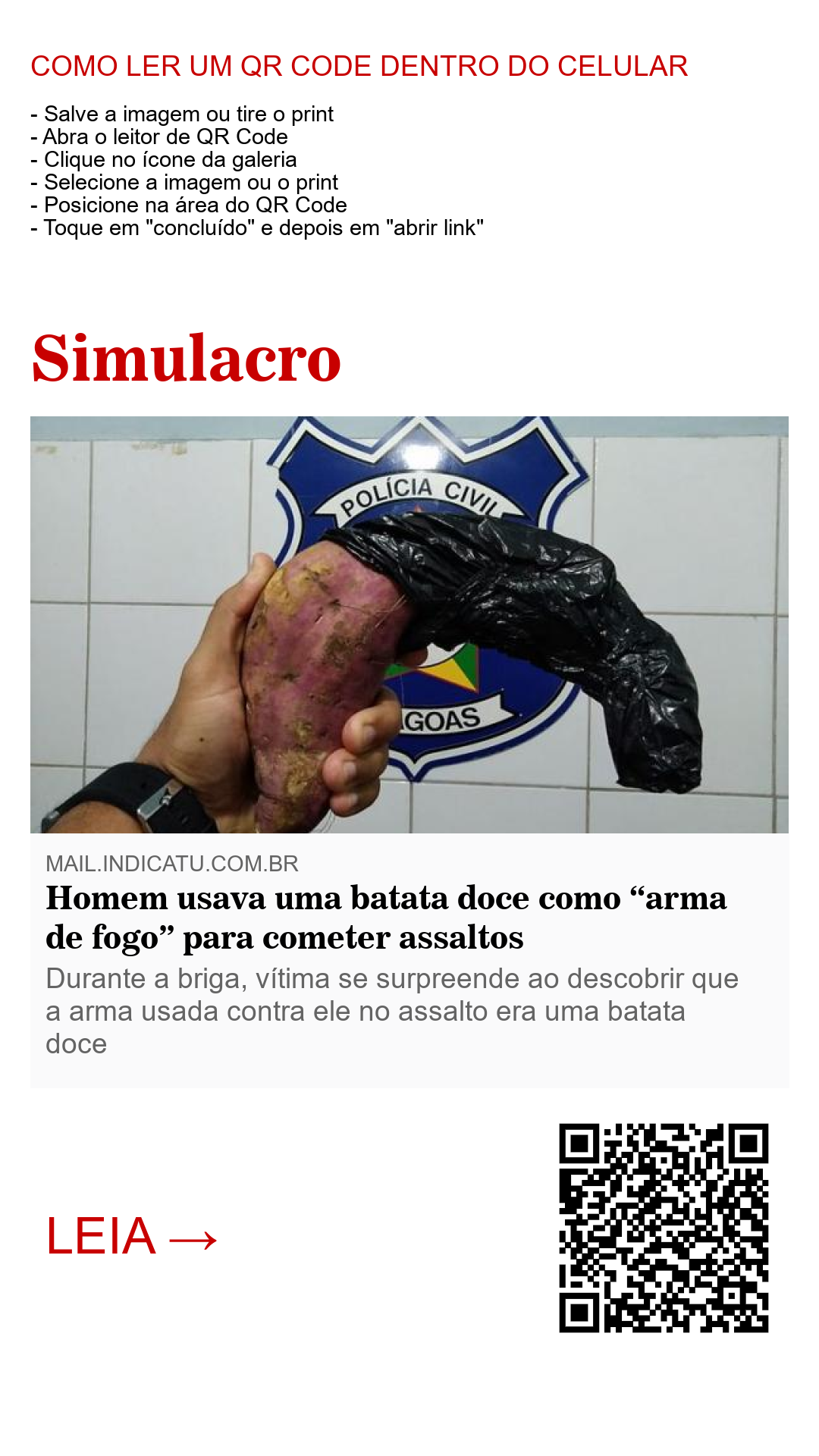 Chegou ao fim a saga do indivíduo que usava uma batata doce revestida em um saco plástico preto para simular uma arma de fogo, render e assaltar as vítimas em Maceió, no bairro Benedito Bentes. A vítima da ação criminosa foi um motociclista que tinha sido abordado pelo meliante e obrigado a conduzir a motocicleta até um matagal. Chegando lá, o criminoso Samuel Lira Rodrigues de 29 anos começou a espancar a vítima com uma barra de ferro, que desconfiou da ação, criou coragem e entrou em luta corporal com o mesmo até conseguir dar-lhe uma ‘chave de braço’ e imobiliza-lo.