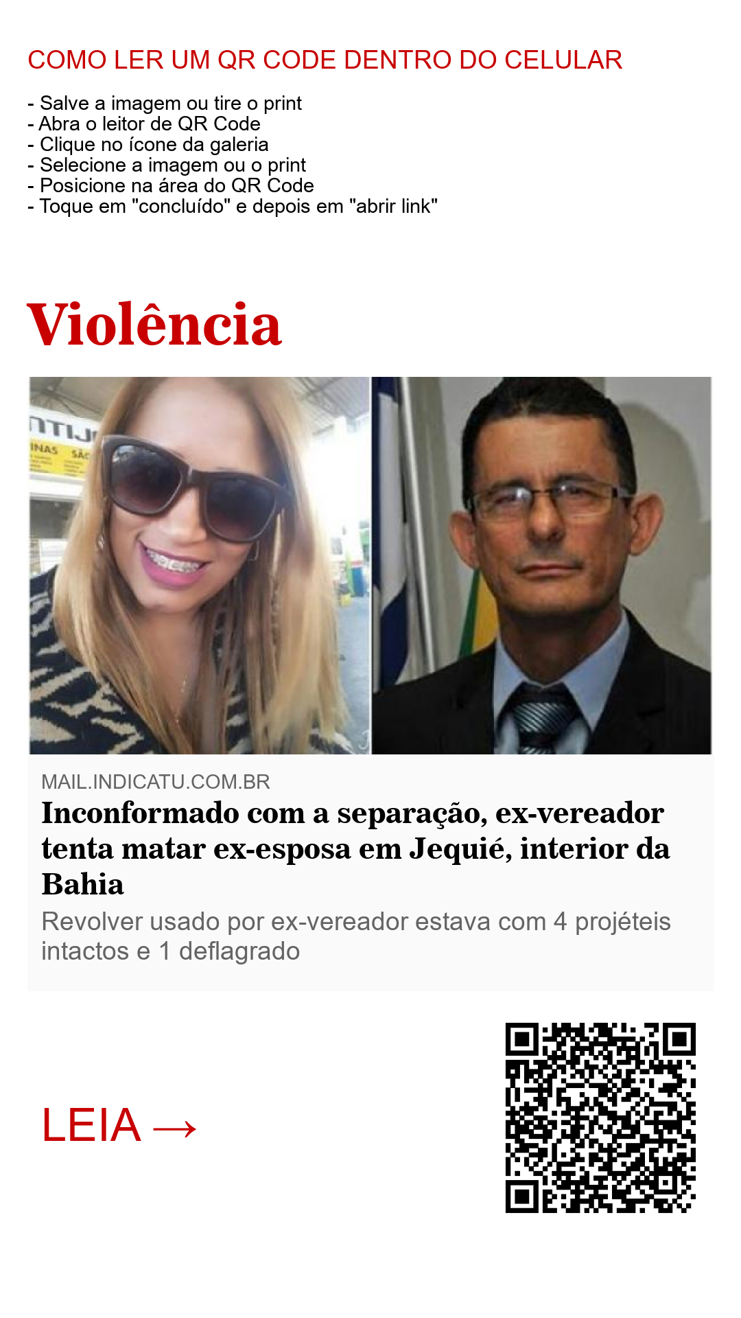 O ex-vereador Manoel Gomes, da cidade de Jequié, no interior da Bahia, por volta das 19:00h desta quinta-feira (07), tentou contra a vida da sua ex-mulher, a senhora Marcela Souza, sua ex-esposa, enquanto a mesma saia de um hospital na rua Abílio Procópio, região central de Jequié.