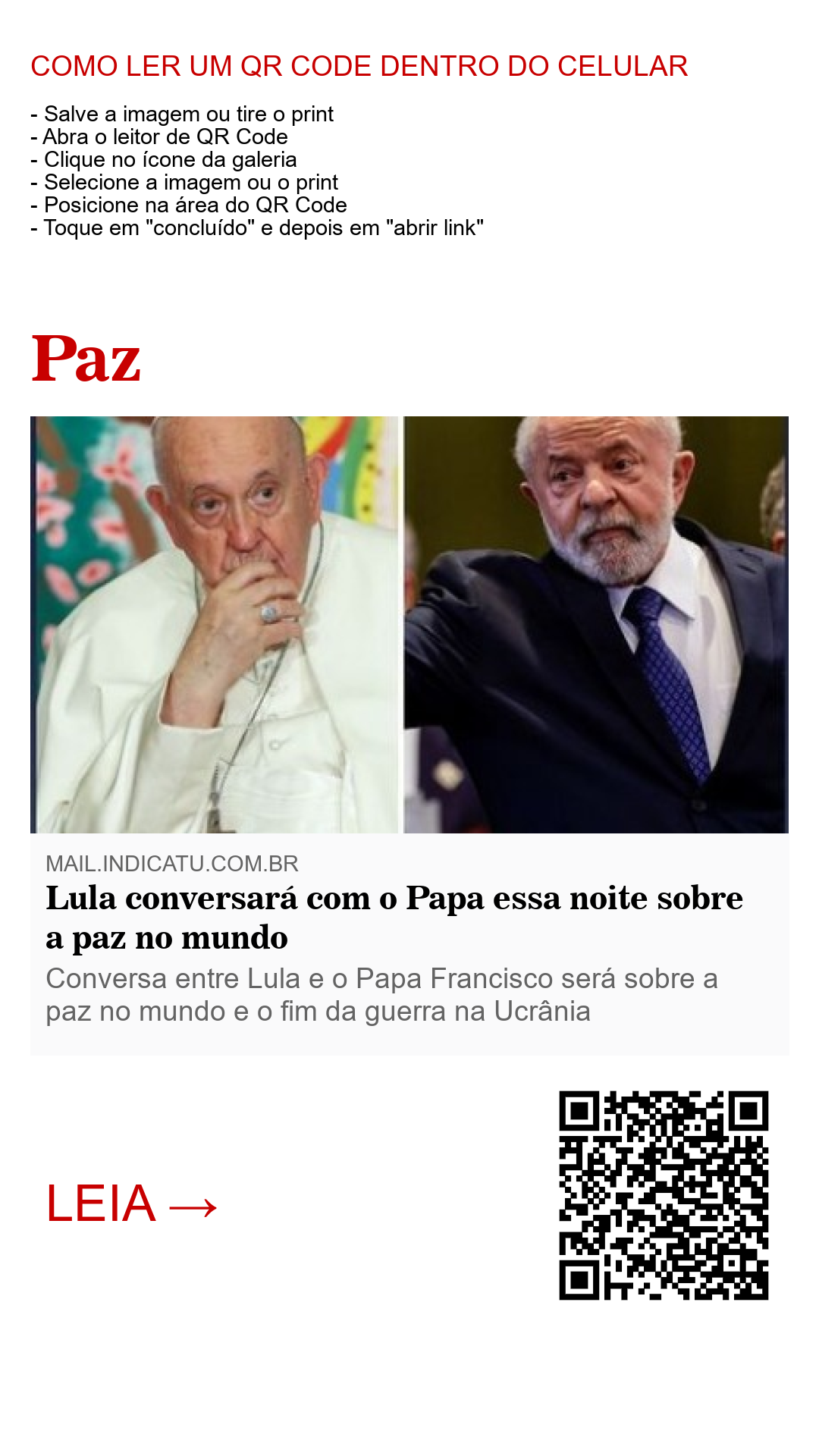 O presidente Luiz Inácio Lula da Silva (PT) vai telefonar para o Papa Francisco nesta terça-feira (30) às 10h, segundo a agenda oficial do Palácio do Planalto. Na conversa, Lula e o papa deverão tratar de assuntos como o processo pela paz no mundo e o fim da guerra da Ucrânia, o combate à fome e a pobreza. Os dois estiveram juntos em 2020, quando Lula visitou o Papa no Vaticano.