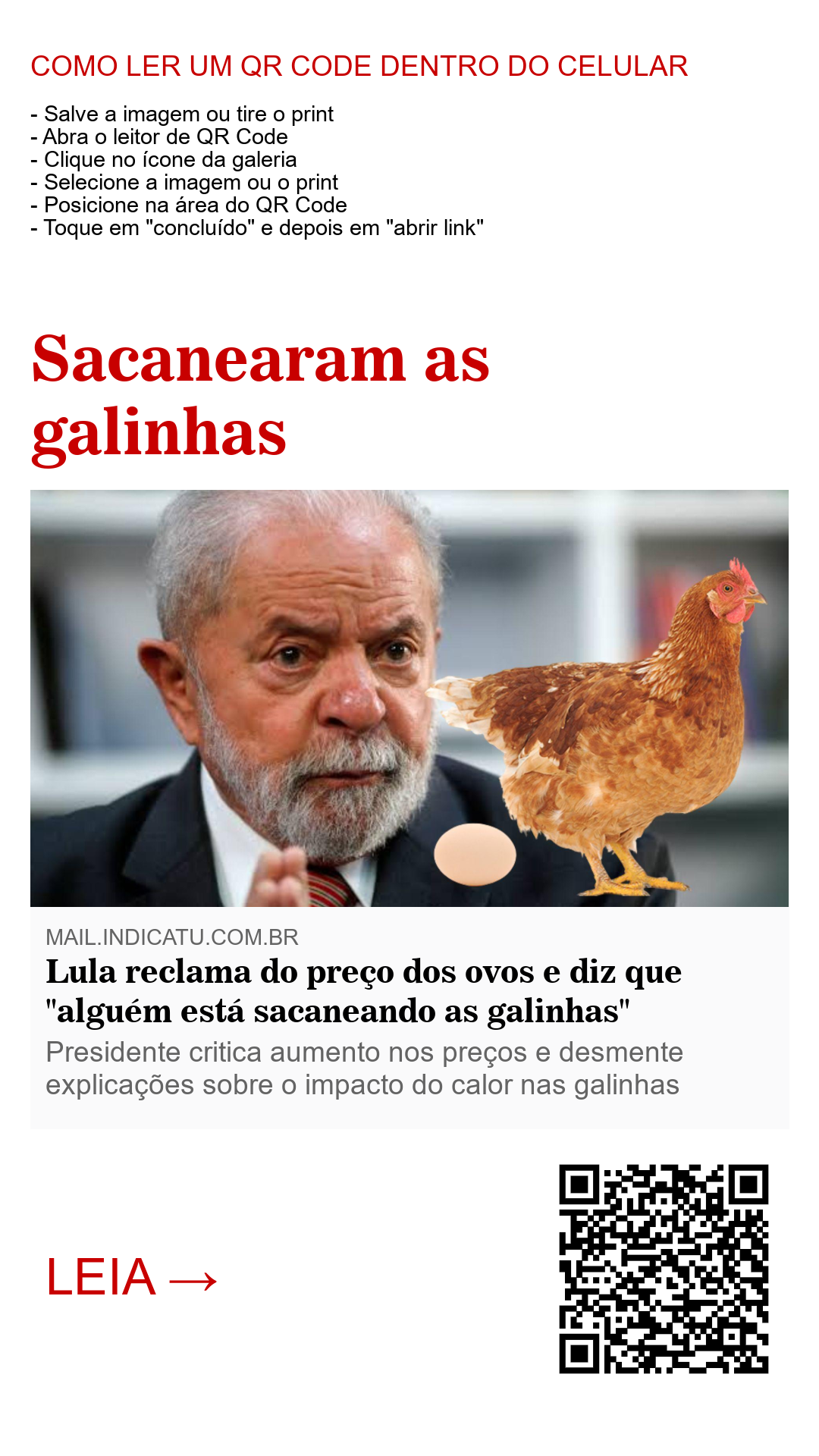 O presidente Luiz Inácio Lula da Silva fez duras críticas ao aumento nos preços dos ovos, afirmando que "alguém está sacaneando as galinhas". Durante uma conferência, Lula tentou desviar o foco da inflação e centralizou seu discurso na produção interna de ovos, negando a justificativa dos produtores de que o aumento seria devido a ondas de calor. O presidente alegou que as galinhas, que vivem em ambientes controlados, continuam produzindo de 2 a 3 ovos por dia e que o calor não está tão intenso a ponto de afetar a produção.