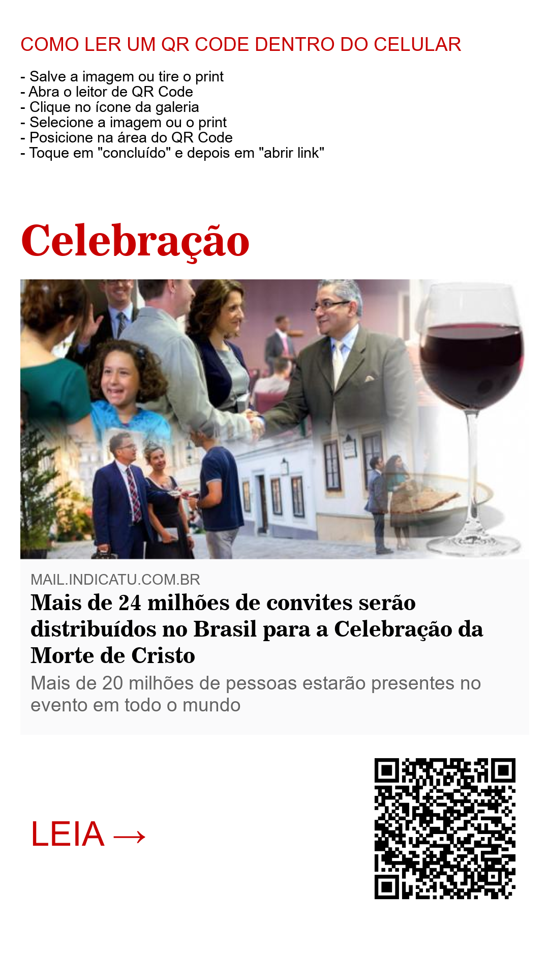 Trinta convites para cada um dos mais de oito milhões de publicadores testemunhas de Jeová. Essa é a meta passada para os membros do grupo empenhados em convidar a população para o evento mais importante e aguardado do ano para as testemunhas de Jeová e demais cristãos.