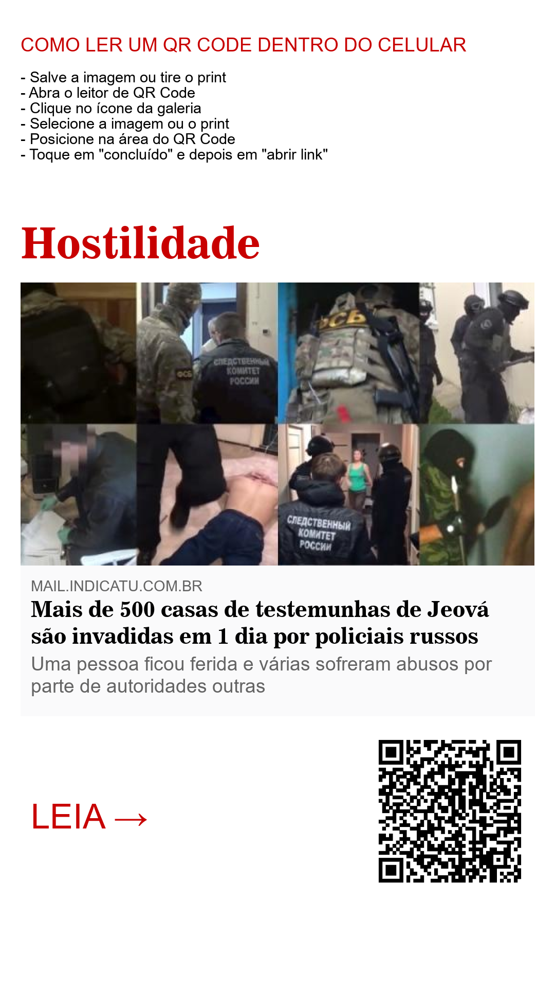 Mais de 500 famílias de Testemunhas de Jeová foram vítimas de mais um ato da intolerância religiosa operada pela Rússia desde que a obra do grupo foi proscrita em 20 de abril de 2017. Segundo as informações do site JW em russo, 512 residências foram invadidas no último dia 17 por policiais para prender e intimidar o restante dos membros Testemunhas de Jeová que persistem em praticar a sua fé. Dentre os atos de repressão relata-se torturas e até sequestros contra os religiosos.