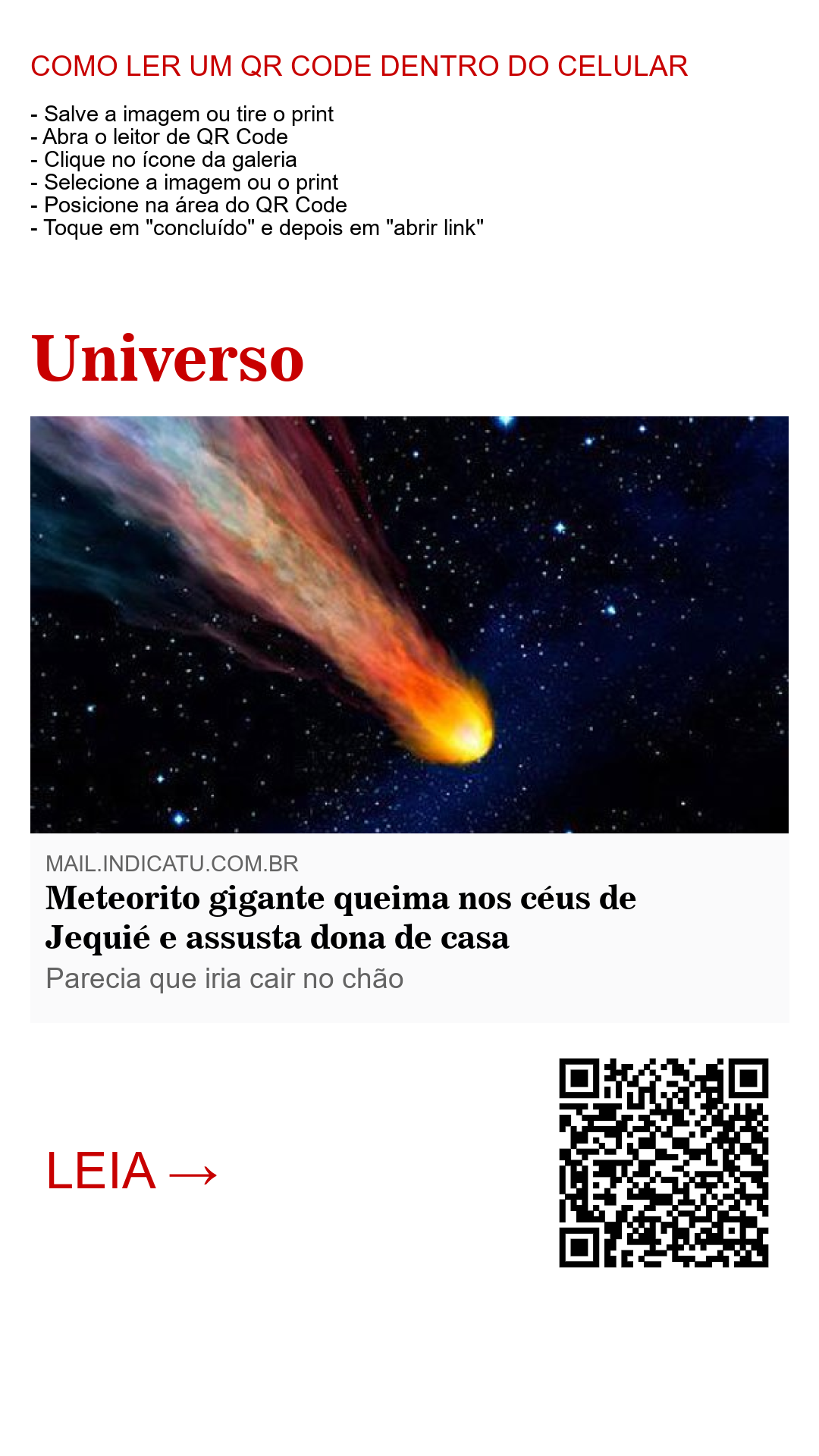 "Foi uma labaredona de fogo que, se eu não estivesse sentada na cadeira, teria desmaiado", relata assustada a dona de casa, que pediu para ter o nome preservado, ao ver o meteorito rasgar os céus de Jequié.