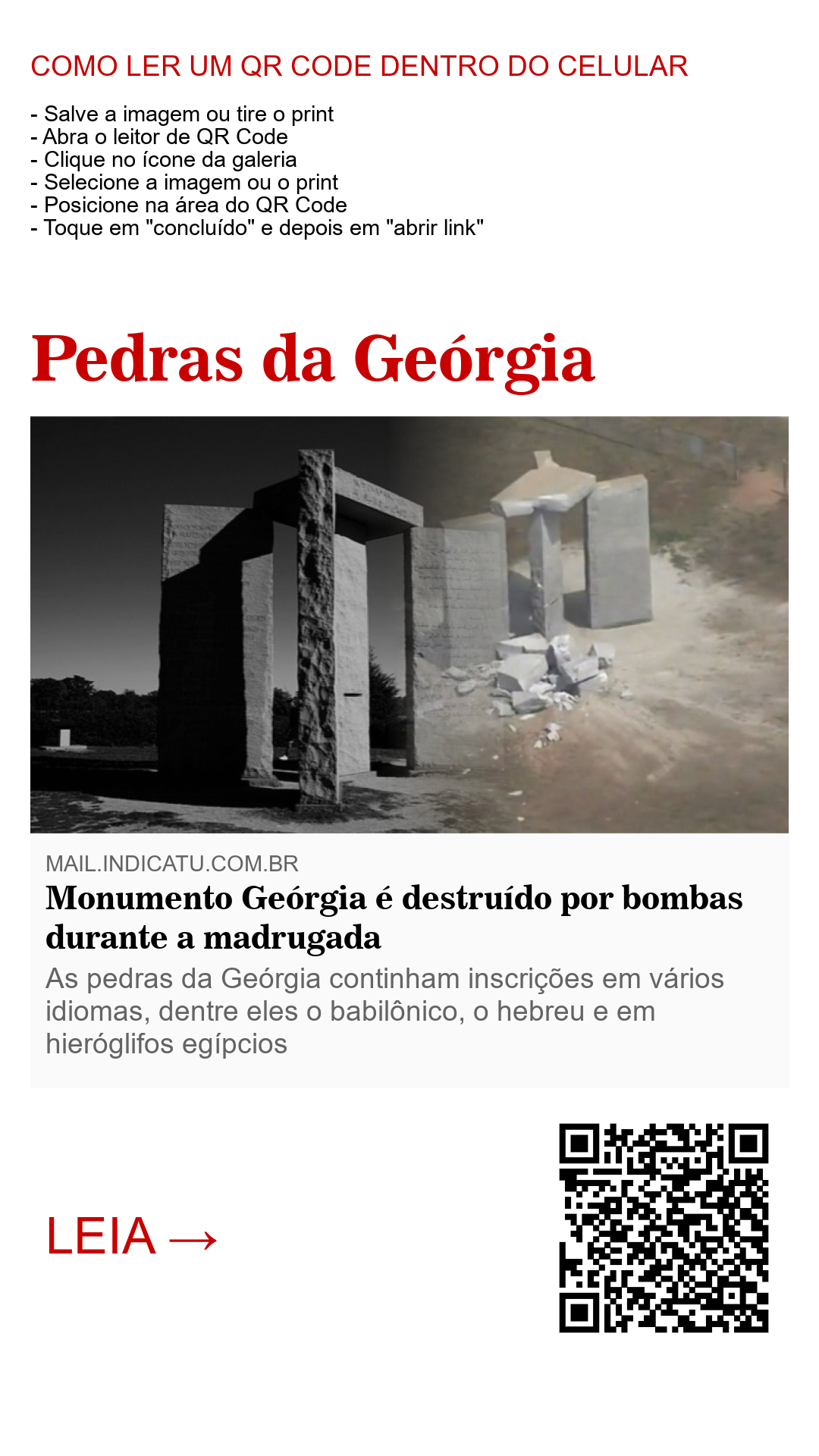 O monumento localizado em Elberton na Geórgia, Estados Unidos, considerado “satanista” por “cristãos”, foi destruído por bombas nesta madrugada de quarta-feira (06). Câmeras de segurança no local registraram o momento em que os explosivos destruíram parcialmente a estrutura de pedras. As avariações causadas pelas bombas obrigaram as autoridades locais a terminarem de destruir a estrutura erguida há mais de 40 anos por representar risco aos visitantes do local.