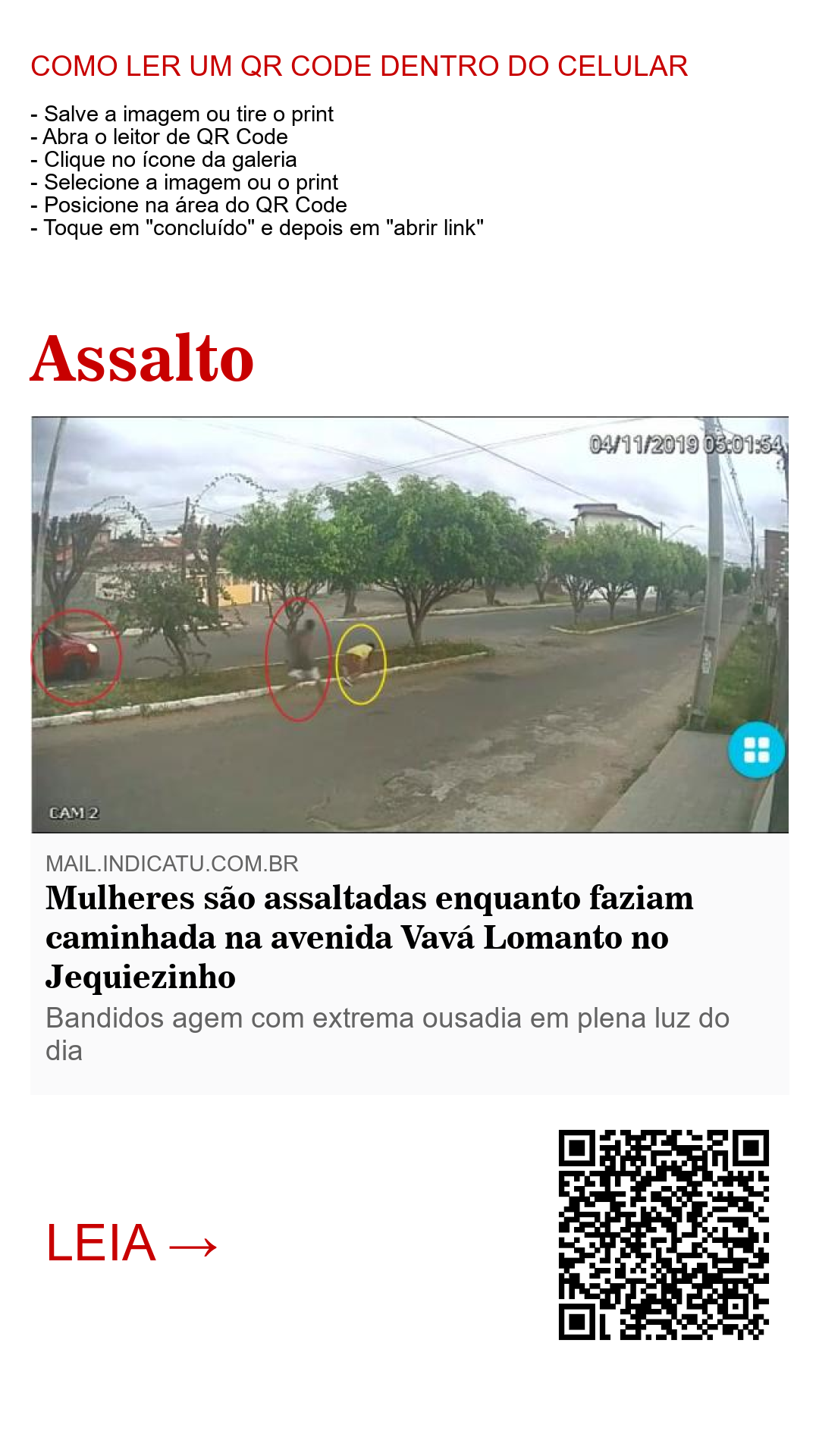 Imagens de uma câmera de segurança flagraram toda a ação dos meliantes que, sem nenhum temor e à luz do dia, abordaram uma das vítimas e roubaram dela um objeto portátil, aparentemente um celular. Nas imagens, duas mulheres caminhavam pela avenida enquanto suspeitaram da aproximação de um veículo que trafegava pela contramão da avenida dupla e, ao perceberem que se tratava de bandidos, correram. Uma das mulheres tropeçou e caiu rente a um dos canteiros que divide a avenida e foi brutalmente abordada pelo marginal que lhe arrancou seu pertence à força.