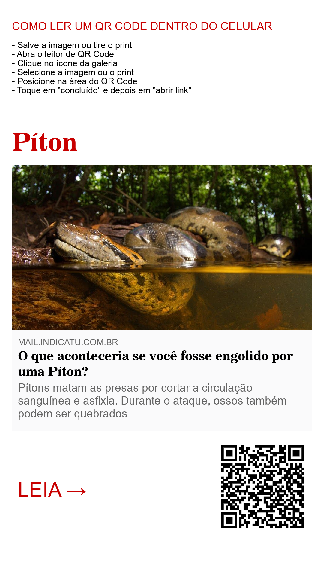 Ataques de Pítons a humanos são raros. Mas caso ocorra, há mais chance de a vítima sobreviver a um bote desses se houver outras pessoas por perto para socorrê-la. Do contrário, resta torcer para que a cobra entenda que aquela não é uma presa sua natural e desista do ataque.