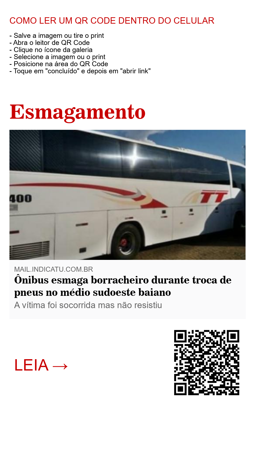 Quinta-Feira, 04 de Janeiro - Segue as informações de que o borracheiro José da Silva Moreira trocava um pneu de um ônibus de turismo no entroncamento de Jaguaquara, no médio sudoeste baiano, na tarde desta quinta-feira, quando, o macaco que sustentava o veículo deslizou enquanto o operário estava debaixo concluindo o serviço.