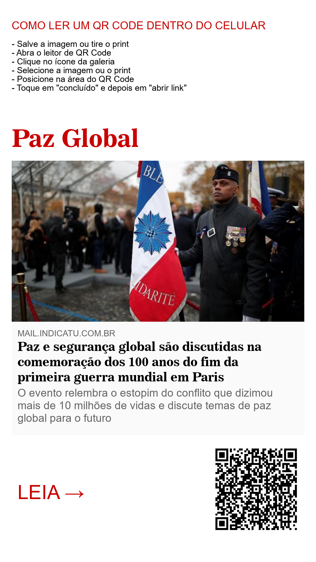 Paris foi o palco escolhido pelos líderes mundiais de 70 países para a celebração do Armistício de 11 de novembro de 1918 que pôs fim ao primeiro conflito armado que envolveu todas as nações. Um dos propósitos do evento é a discursão de uma proposta de paz e segurança global, a pedra angular para a criação da Liga das Nações após o fim da Primeira Guerra Mundial.