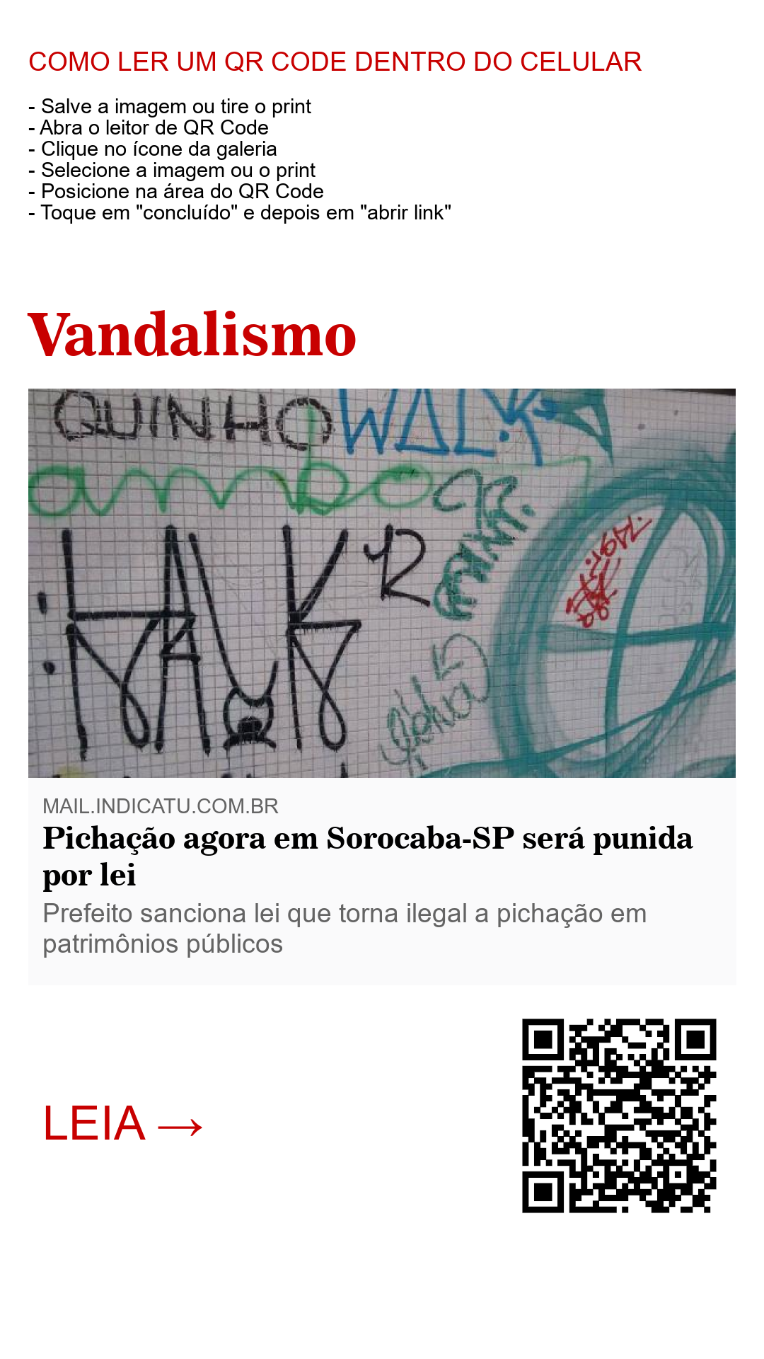 Foi sancionada pelo prefeito de Sorocaba, José Crespo do DEM, a lei que torna ilegal os atos de pichação em patrimônios públicos e privados. A lei que já existia em norma municipal que condena atos de depredação, vandalismo e pichação, agora terão uma abrangência mais ampla. As multas para os infratores será de R$ 1.000,00 sendo que esse valor será em dobro para aqueles pegos em reincidência.