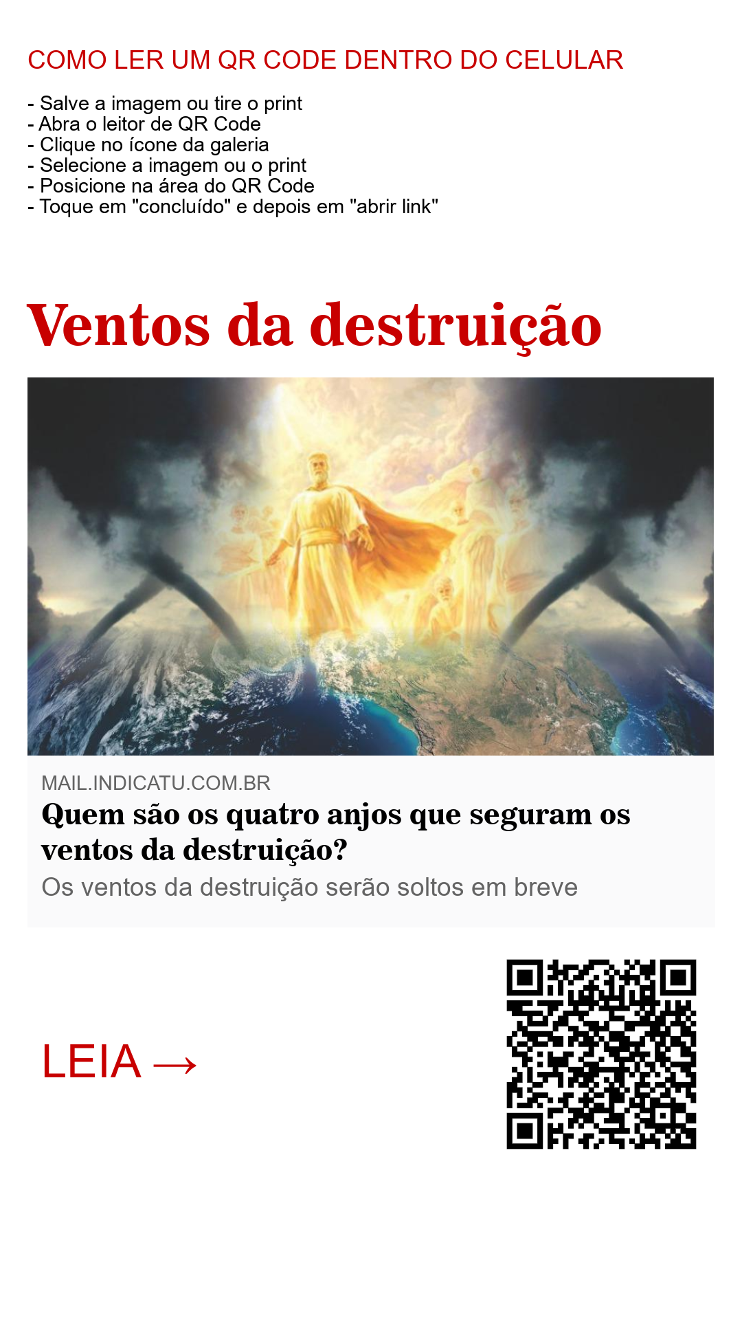 Quatro anjos estão segurando firmemente os ventos da destruição que se abaterá sobre a terra em breve. Essa é uma das designações mais importantes já atribuídas às criaturas angélicas, e eles encaram isso como um grande privilégio dado por Deus. Quem são os anjos que seguram os ventos da destruição? Podemos ter uma pista de quem são esses anjos pela posição em que eles se encontram em suas designações. Ao falar sobre eles, o texto em Apocalipse diz: