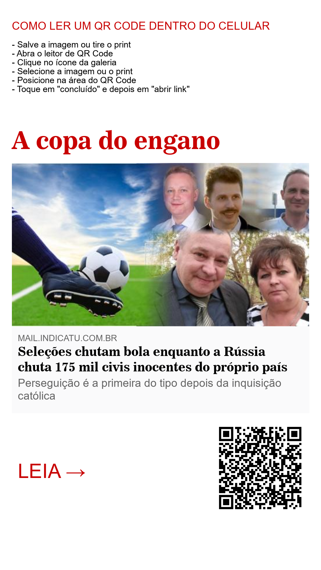 Enquanto nações do mundo inteiro estão dando chutes em um ser inanimado, uma bola, competindo entre si para ver quem é o melhor, quem levará a taça que, nesta copa, foi caricaturada por designers brasileiros como uma medonha caveira em um inferno em chamas, sim, enquanto as seleções chutam uma bola e outra em direção ao gol, a Rússia chuta do seu território 175 mil civis, nascidos no país, da sua terra natal em direção ao asilo estrangeiro, quando não os mandam para as prisões. E o que é mais incrível: Você continua achando que tudo isso é normal!