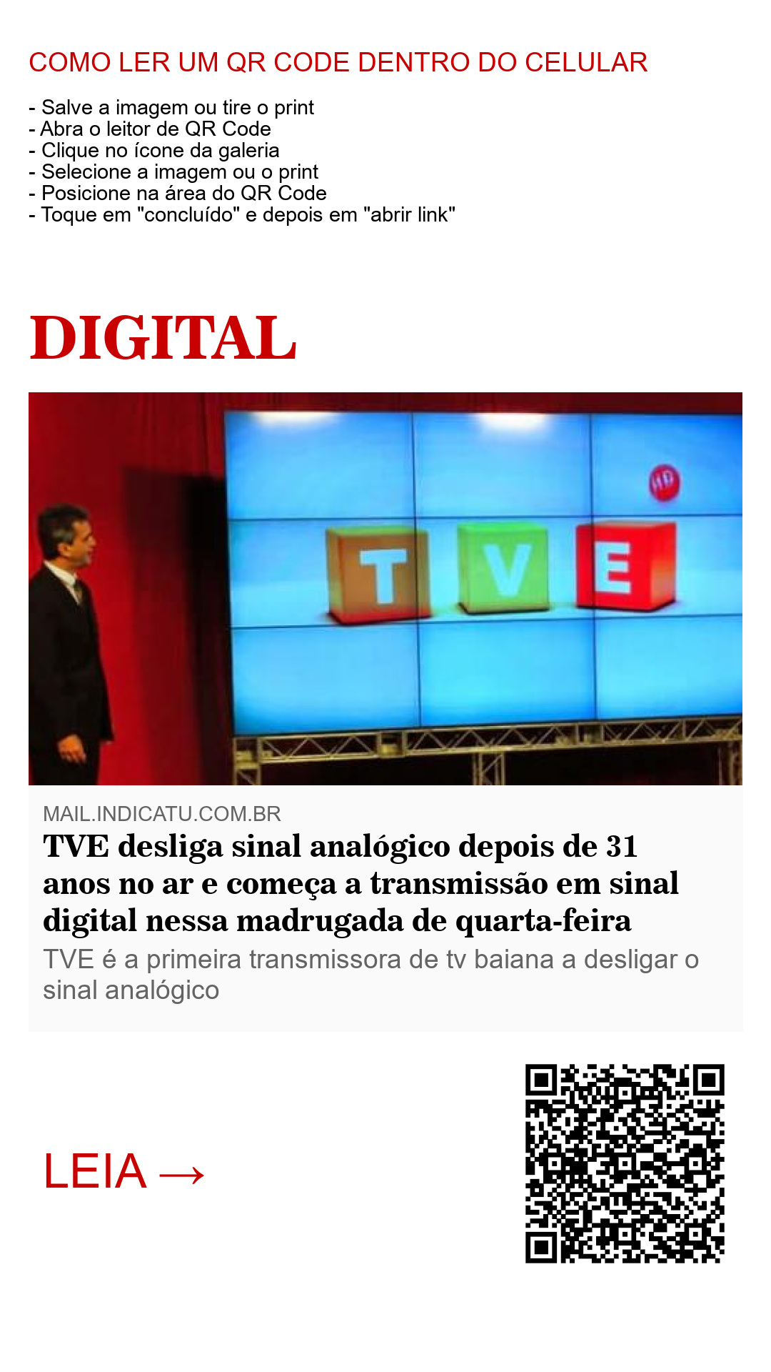 Está encerrada a transmissão em sinal analógico da emissora TVE (Televisão Educativa) . A partir desta quarta-feira (26), começa a transmissão em sinal digital da TVE em todos os 19 municípios baianos, incluindo a capital Salvador, cobertos pela emissora. Ao sintonizar no canal a partir de hoje, o telespectador encontrará uma mensagem informando que a transmissão em analógico foi encerrada e a recomendação para o ajuste em sinal digital.