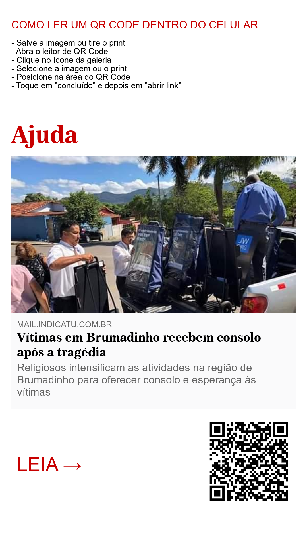 As vítimas do crime ambiental em Brumadinho, cidade do estado de Minas Gerais no Brasil que ficou mundialmente conhecida após o rompimento de uma barragem de rejeitos de minério, estão recebendo mensagens de consolo e esperança de modo maciço do primeiro grupo religioso a chegar até o local afetado. Vários religiosos do grupo testemunhas de Jeová se deslocam a todo instante para a região da tragédia com carrinhos de publicações contendo assuntos variados que focam no consolo emocional de pessoas vítimas de tragédias e outras situações de crise que afetam a saúde psicoemocional de quem teve a tristeza de ter sua rotina interrompida pelas incertezas da vida, ou, como é o caso em Brumadinho, pela falta de responsabilidade e critério dos responsáveis pelo empreendimento de alto risco que custou, até agora, as vidas de mais de 100 brasileiros.